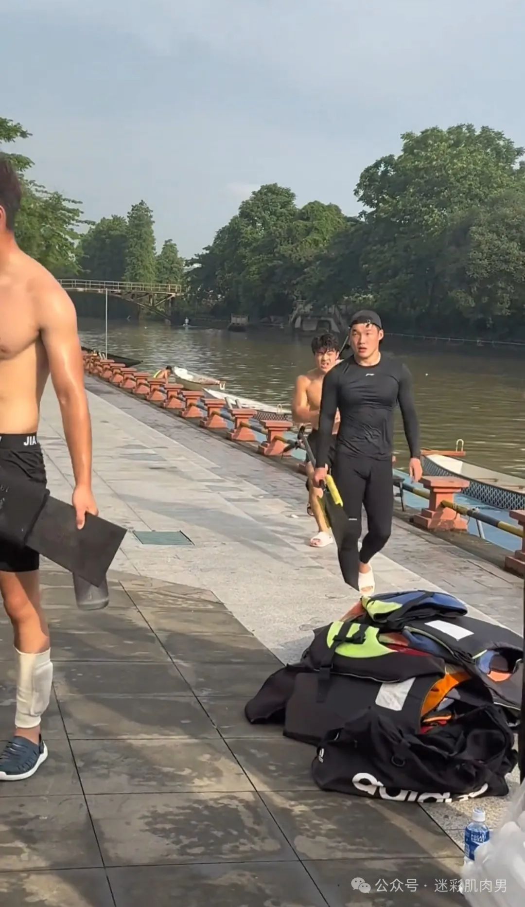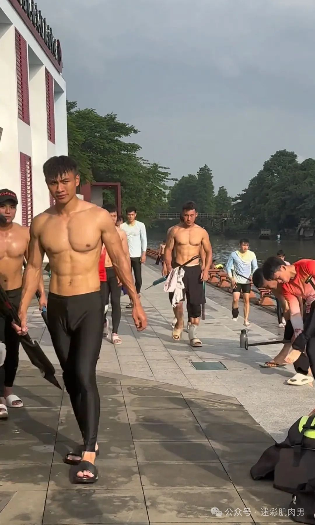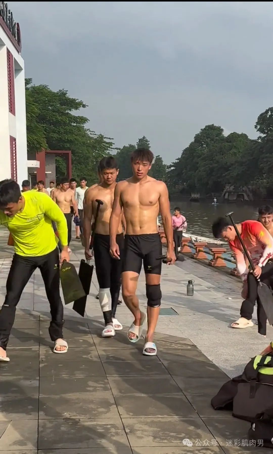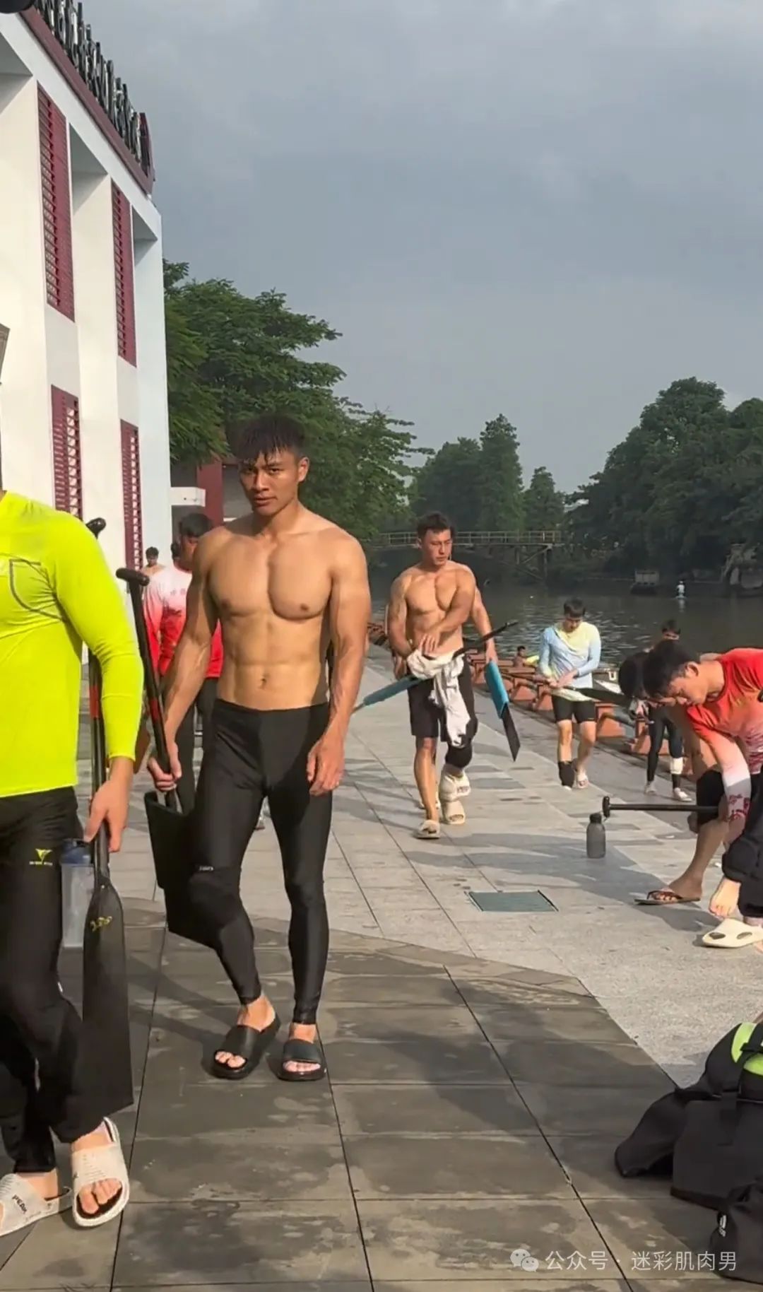 划龙舟穿紧身裤的运动男边走边脱?