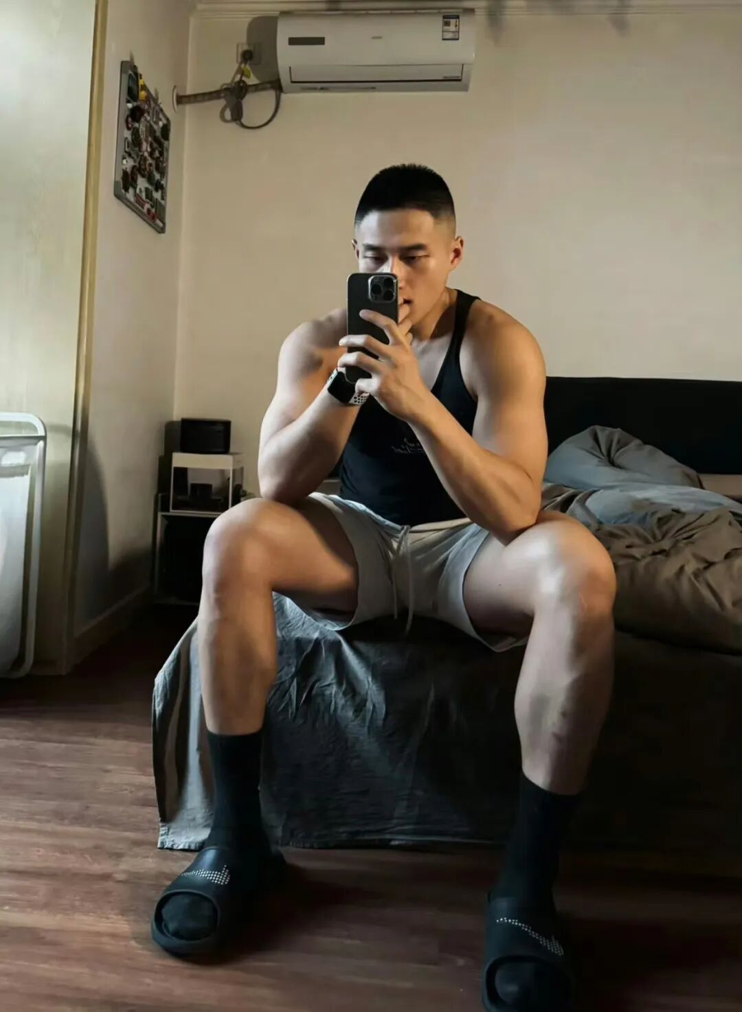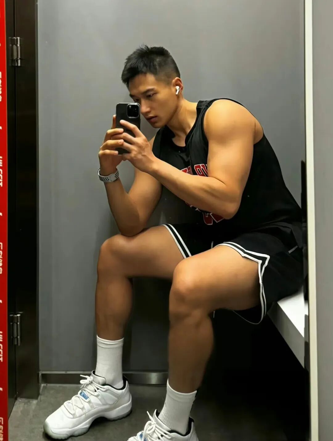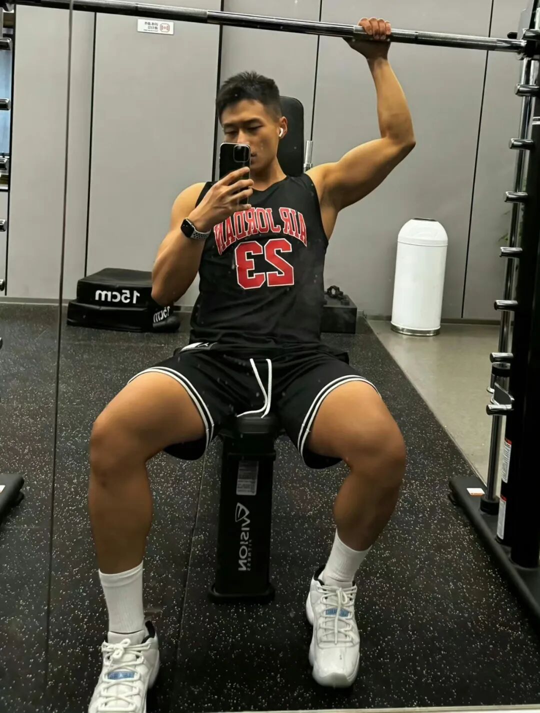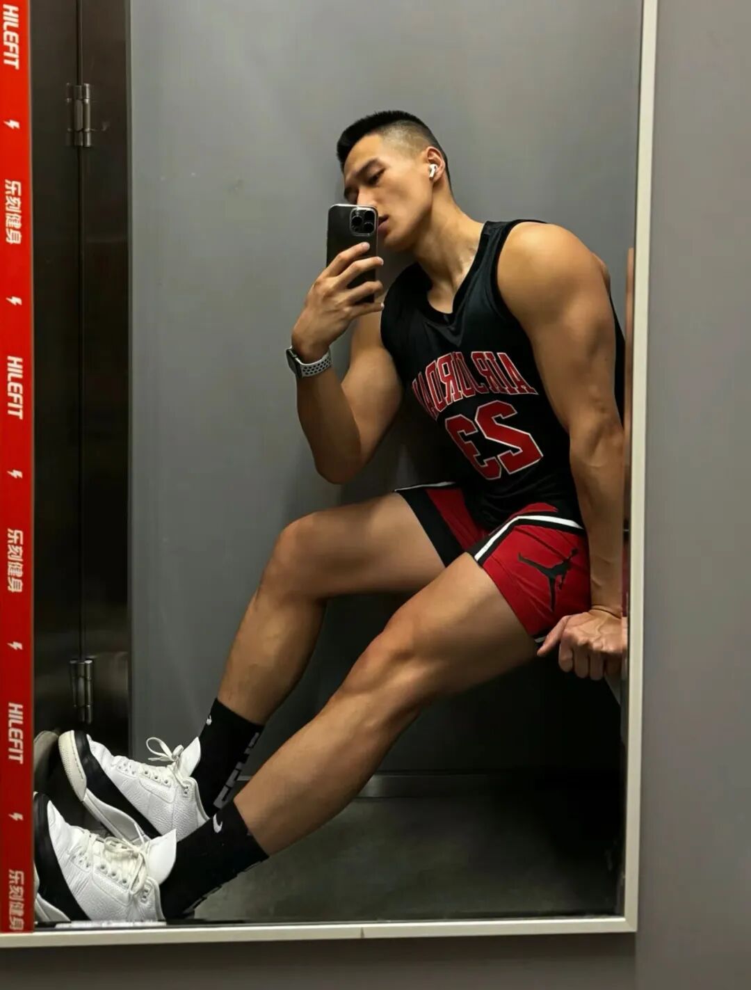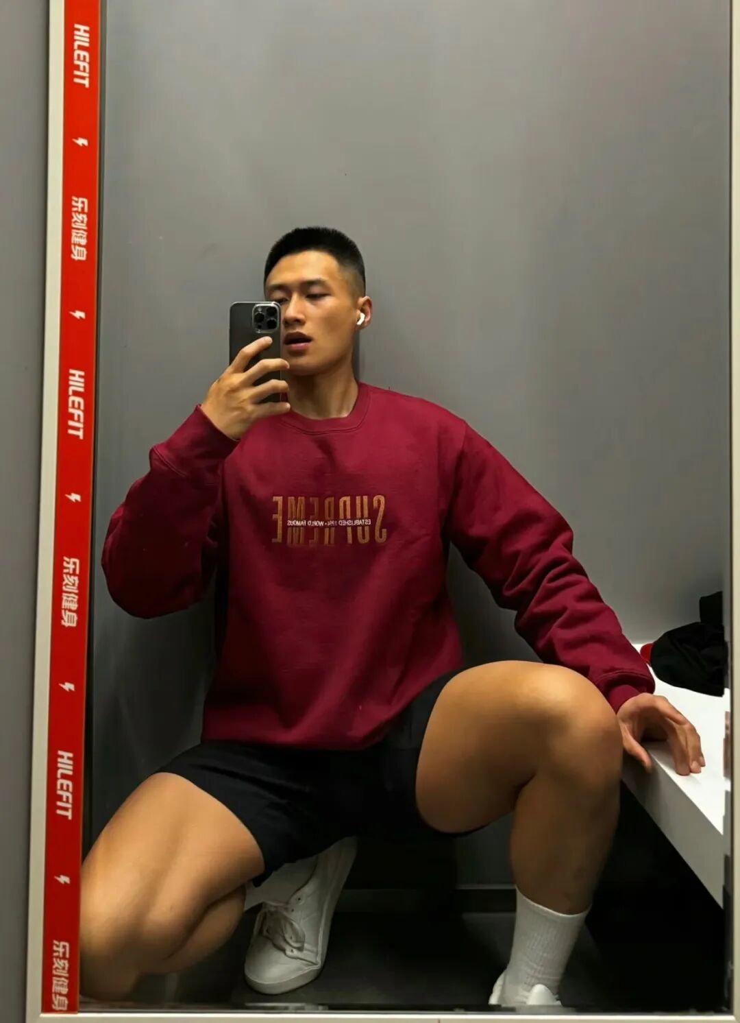 他在健身房完成了一天的腿部训练,站在镜子前,他套上了一双白色的运动袜,准备自拍。
