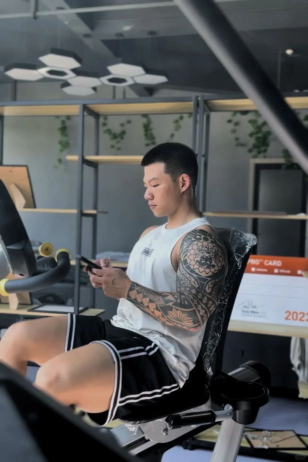 他在健身房眼神坚定的玩手机。那一刻,他不再是那个奶萌的小男孩,而是在回宝子们的消息哦