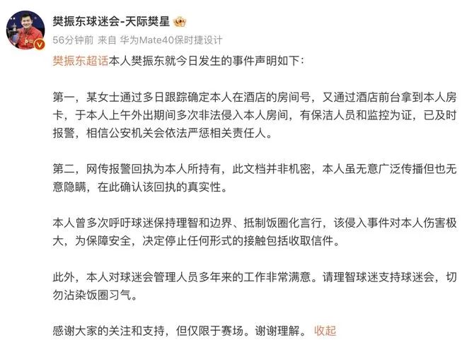 当然在这次事件的主角是一名女士,只要你够优秀不管是男粉还是女粉都是非常多的了,这位女士跟踪樊振东并通过前台拿到了房卡,趁樊振东出去后,她多次潜入樊振东的房间。最后,她选择拿走了樊振东最贴身的衣物,这样的行为真的不是正常粉丝能够做出来的。在这里我要问下大家了,你喜欢这样的运动小哥吗? 说实话樊振东魅力十足,娃娃脸,看上去还蛮乖的! 大家可以欣赏他的照片,可以观看他的比赛,甚至可以去找他合影签名,这种过界的行为就太不耻了。