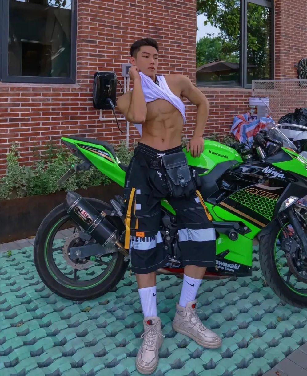 成为运动博主后,他更是深谙流量之道,经常分享一些网友们喜闻乐见的照片,比如骑摩托车时露出的腹肌,或是穿上紧身骑行服骑单车的英姿。