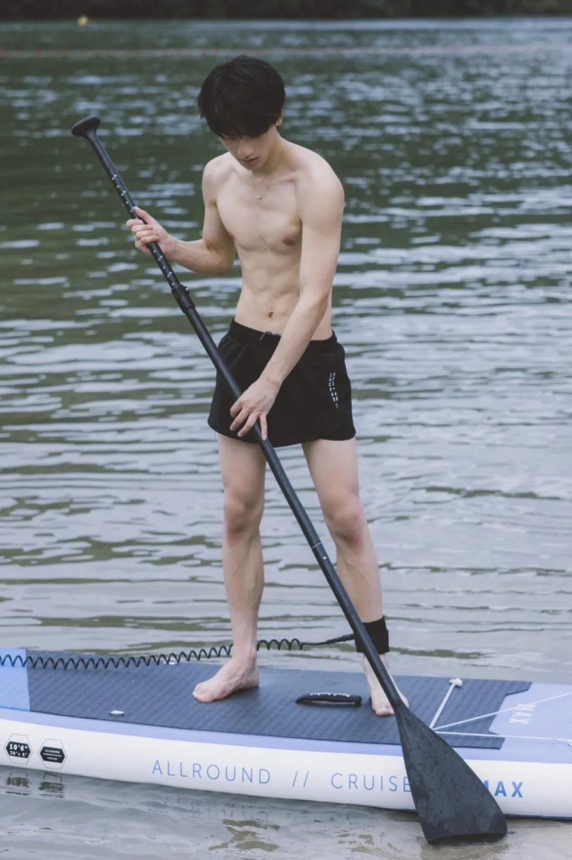 阳光白皮薄肌男大,小鲜肉湖上划艇撩腹肌