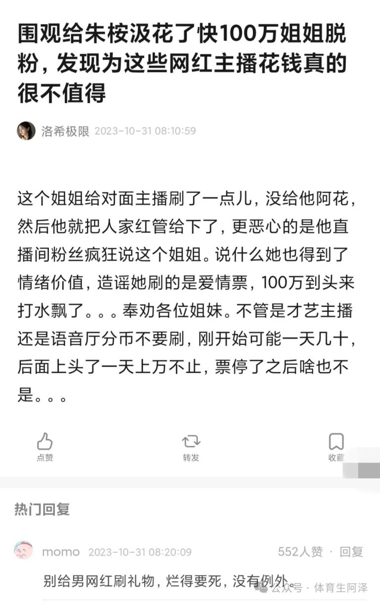 先看爆料,起因是怒刷百万的大姐,在打pk的时候给对面上了点票,没有给他这边上。然后他就开始癫了,把大姐管理下了。所以是有钱就供着你,什么都依你,句句有回应。更何况现在还不是没钱的时候,都这样做,阿泽真搞不懂他的脑回路哈哈哈哈哈。 所以说一切都有因果,网红在这个时代是吃上红利了。大家思想变了,这要是在以前,能施舍你两个都不错了。还因为这个把大姐得罪了。