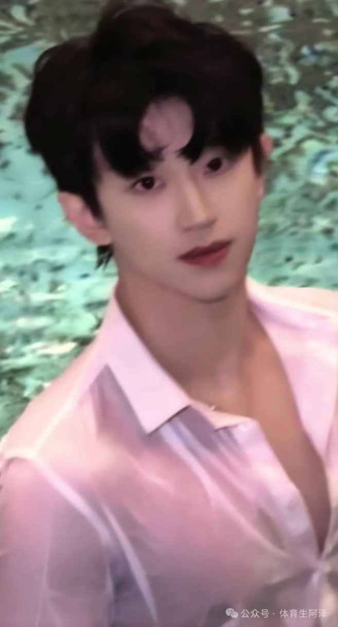 而且这张也是,纯纯为了 拍视频游泳,在泳池里面打湿衬衫,然而头发造型是一点没湿啊哈哈哈。最重要的就是露出他的胸肌是把,还略微解开两个扣子。不过确实喜欢看,有那种不经意见露出肌肉的刻意了哈哈哈哈哈。