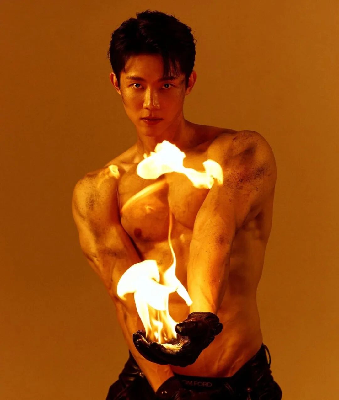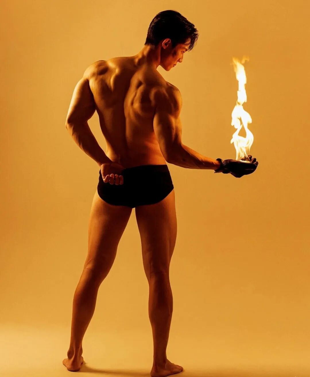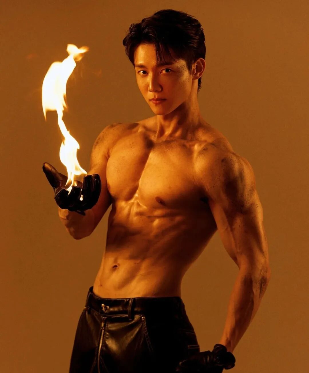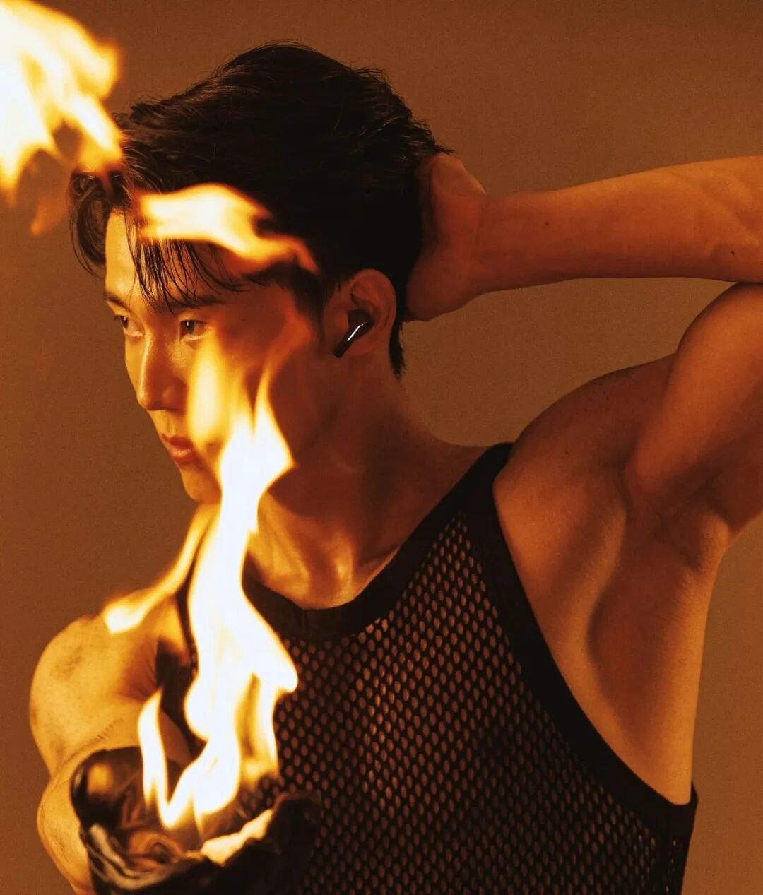 穿上黑色渔网镂空衫的他, 眼神冷峻, 将火焰握在手中, 仿佛一切都在其掌控之中, 冷艳又霸气。