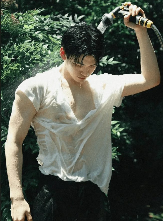 这用水直接从头顶浇灌而下,赤裸的上身,洁白如玉的肌肤,饱满又流畅的肌肉线条,性感之中,都是赤裸的诱惑,演绎出了少年的绝美风姿。