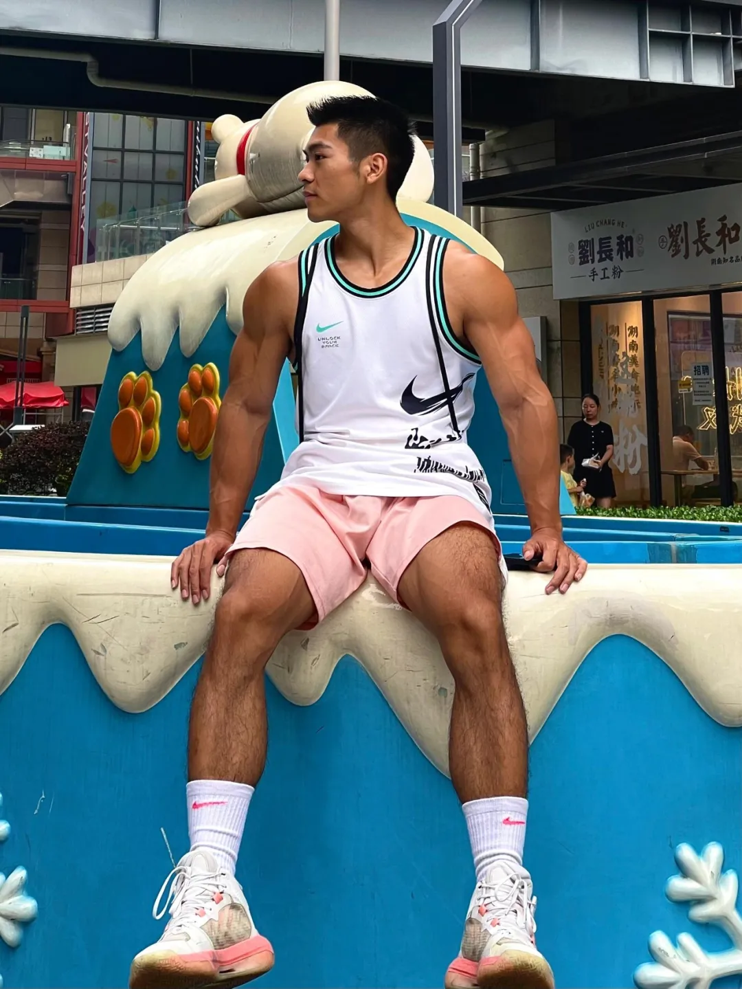 小哥的穿搭非常运动,男性性张力十足。
