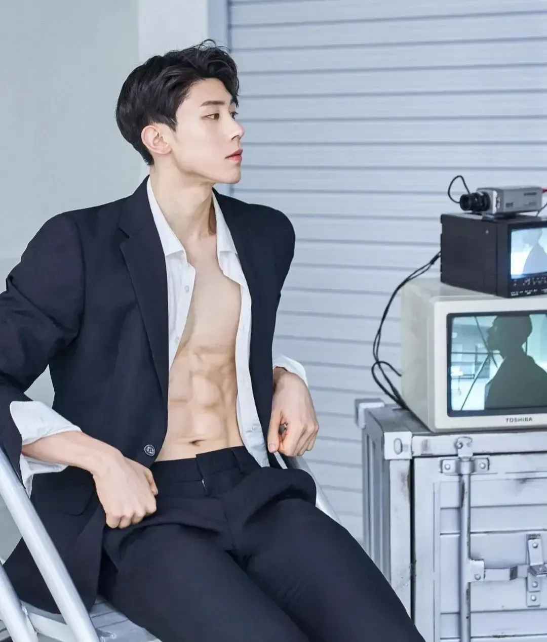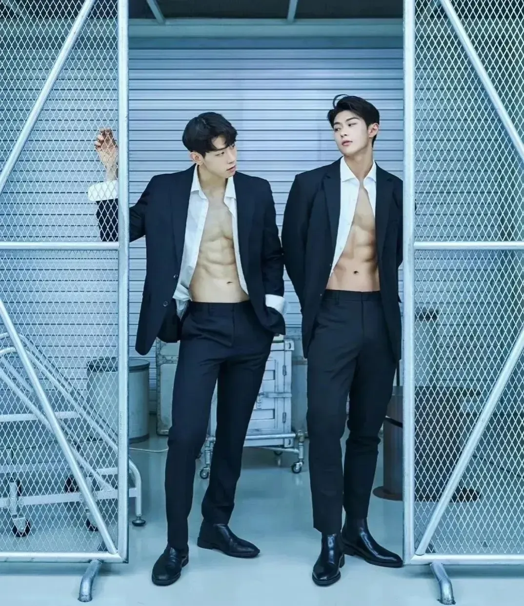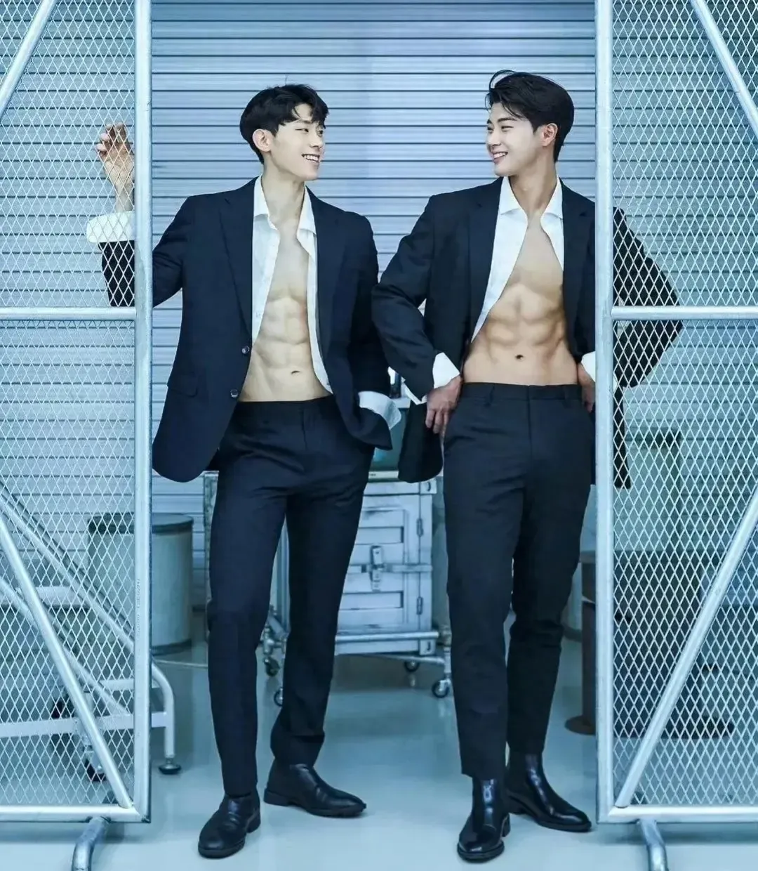 韩国双人西装男模特 雪白的胸肌 发光的腹肌