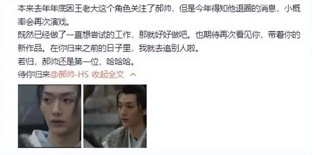 在没有经纪公司运作支持,没有足够多的影视资源,也没有任何曝光的情况下,艺人发展可谓举步维艰。这对三十岁就退圈的郝帅而言,未尝不是一件幸事。