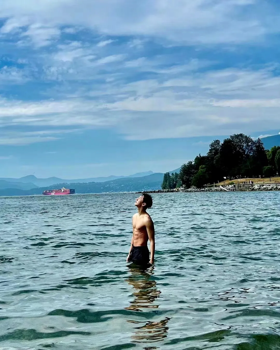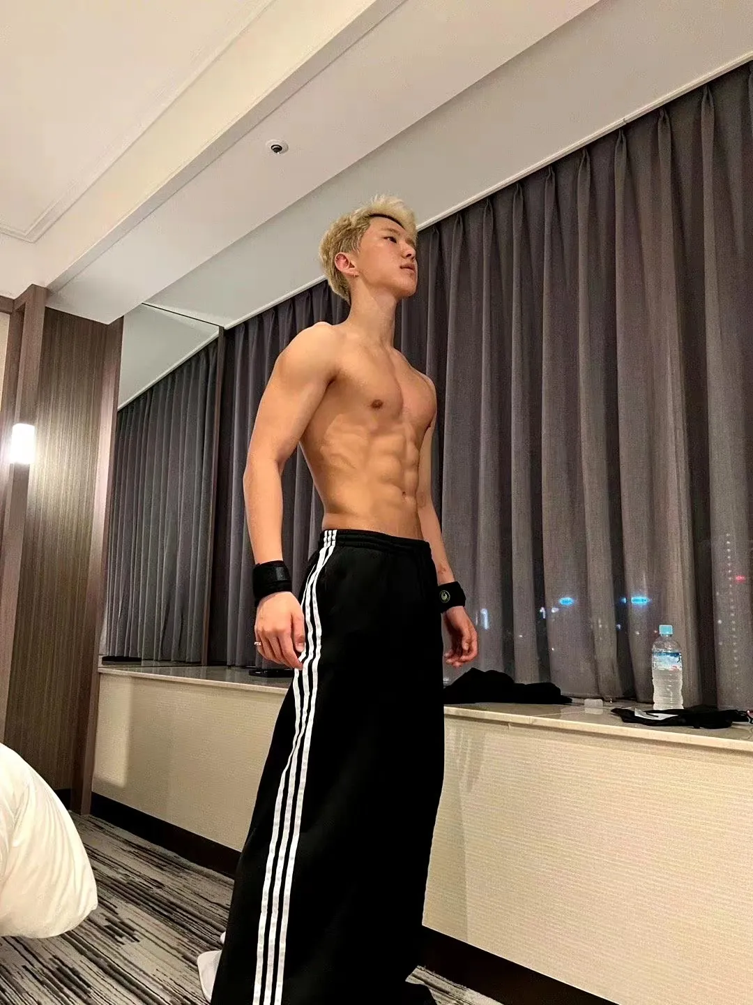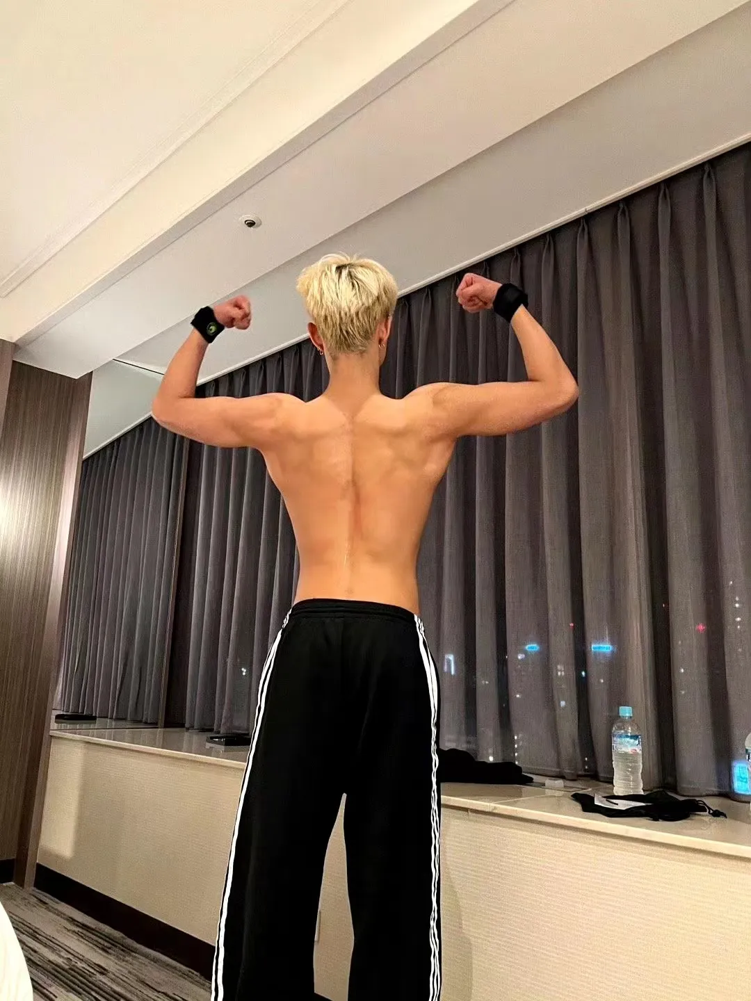 侧面照八块腹肌十分明显,背面照则展示了自己宽肩细腰和略微发达的肱二头肌。