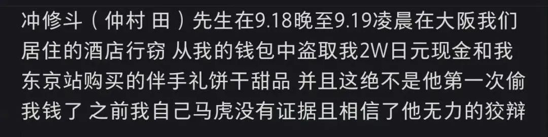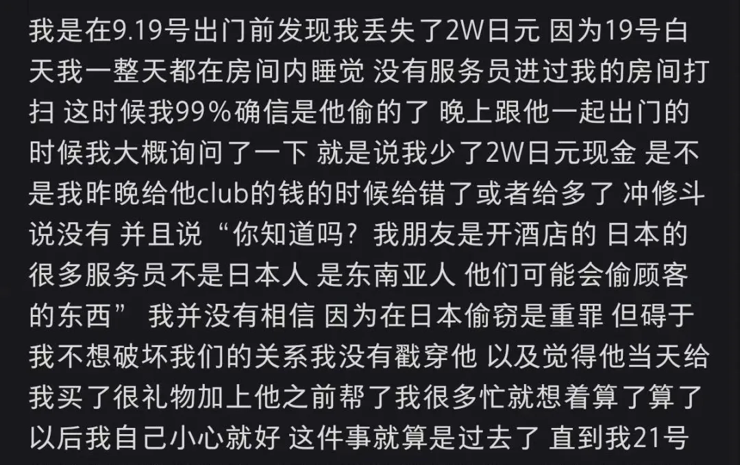 给大家总结一下就是:该名网友Charles和冲修斗在日本同游,两人一起购买过伴手礼饼干,一起入住大阪的酒店 Charles在19号出门前发现自己丢失了2万日元,按照今天汇率换算是974.54元人民币