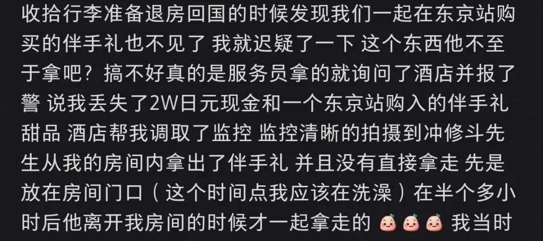 但素点燃Charles的居然是伴手礼饼干。21号Charles准备退房,发现自己买的伴手礼都没了,当时迟疑认了,觉得这么点东西应该不是冲修斗拿的,可能是服务员拿的,才报警了。结果看监控发现是冲修斗先从房间拿了出去放在门口,直到他离开时候才能从门口提走。 除此之外,Charles还曝光了日常相处中,冲修斗嫌弃博主不懂日本规矩,不懂吃饭礼仪,总是生气