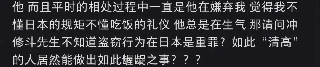 除此之外,Charles还曝光了日常相处中,冲修斗嫌弃博主不懂日本规矩,不懂吃饭礼仪,总是生气 目前因为自己已经回国,没办法跟进,所以发文请大家避雷。