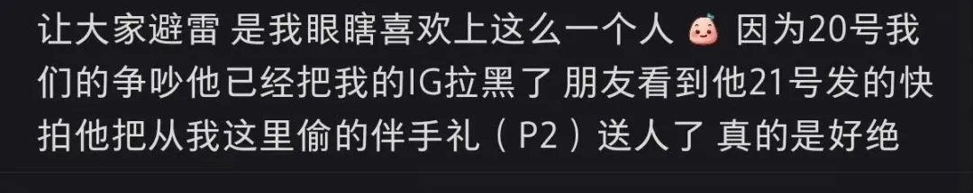 目前因为自己已经回国,没办法跟进,所以发文请大家避雷。 第一次发文之后,Charles表示原贴被删除了,今日他又重发,Charles说两人因为争吵,自己的IG被冲修斗拉黑,但是Charles的朋友却看到冲修斗21号发了快拍,快拍就是冲修斗把从Charles处偷的伴手礼送了别人