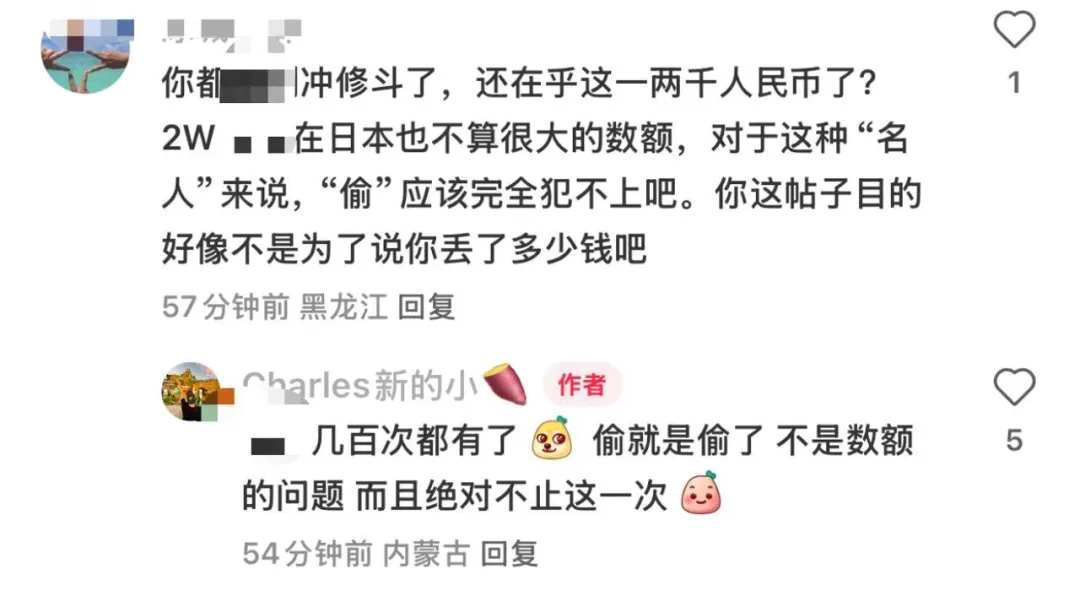 这件事把大家的八卦之火全部点燃了。有网友认为,这就是一两千人民币,对于这种名人来说根本不值一提,根本犯不上,认为Charles曝光是别有目的。但Charles不仅回复表示他偷了绝对不止一次