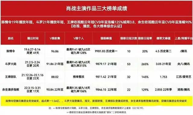 虽然从数量上来看,肖战的主演作品不多,但是从质量上来看,却部部精品。猫眼、V榜和德塔文三大权威榜单中,肖战主演作品《陈情令》、《斗罗大陆》、《王牌部队》和《余生请多指教》,不是拿了年冠就是排行前三甲,其中有三部还是上星电视剧。