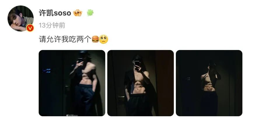 许凯在配文中称请大家允许他吃两个汉堡,其实是因为前期他拍戏要控制饮食,现在想吃个欺骗餐
