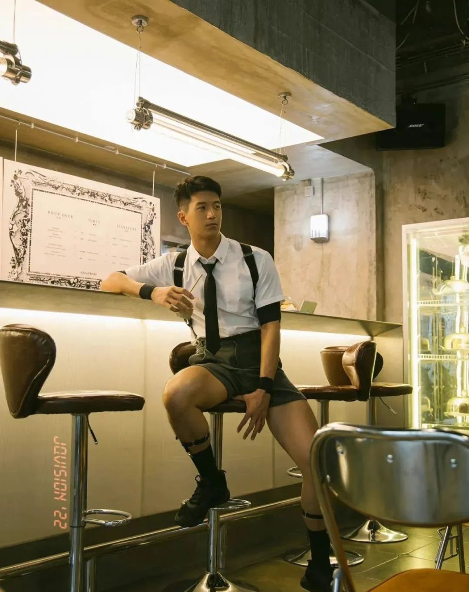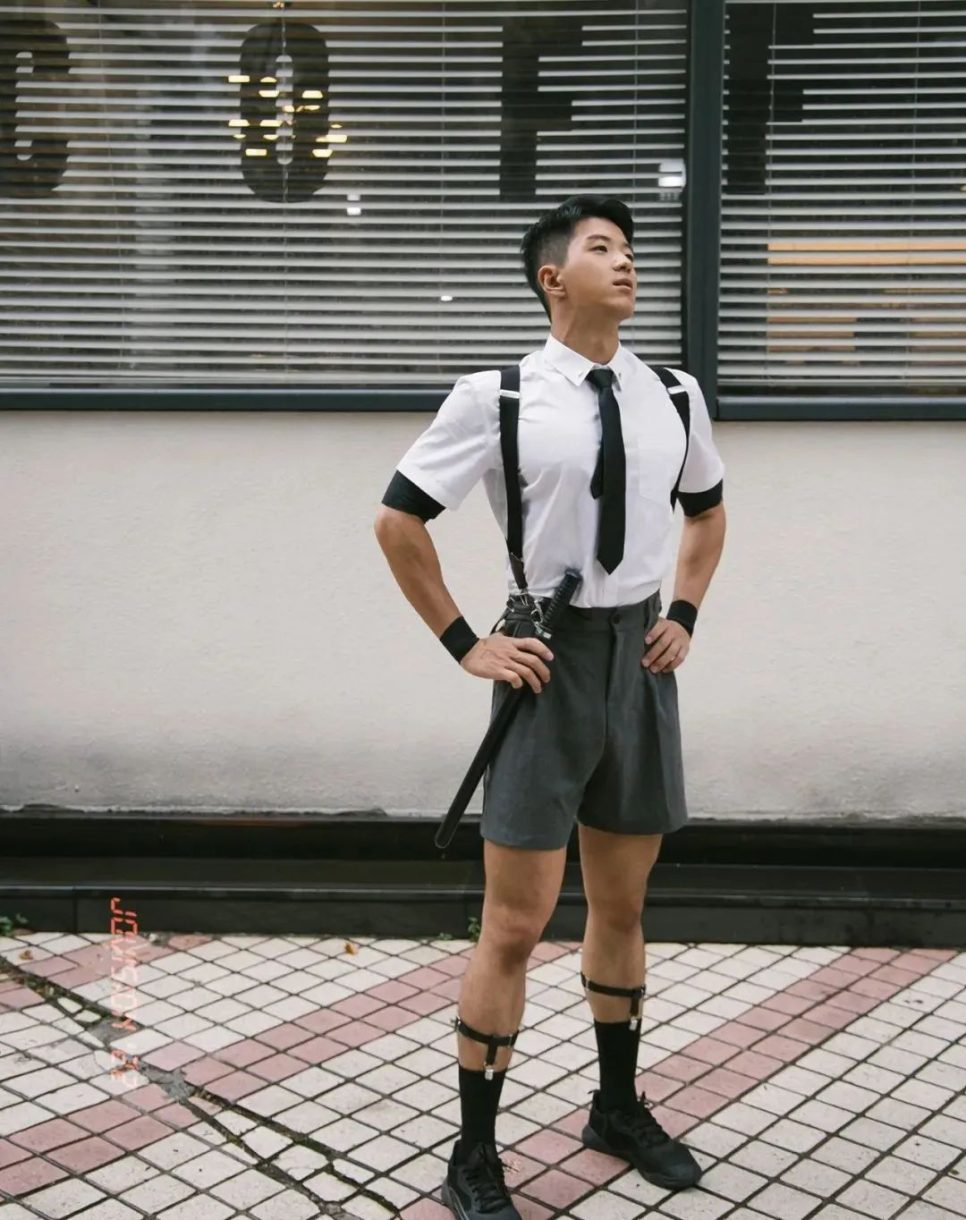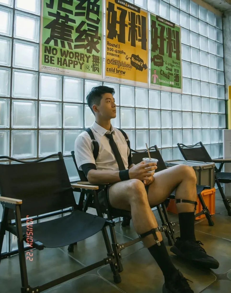然而,纪教练最让人难以忘怀的,当属他那独特而又充满魅力的着装风格。那身西装短裤搭配黑色吊袜夹的装扮,无疑是一种视觉上的强烈冲击。黑色吊袜,这种看似在日常中并不常见于男性着装的元素,在纪教练的身上却散发出别样的魅力。它不仅仅是一种服饰的搭配,更像是一种对个性和时尚的大胆宣言。吊袜紧紧地贴合在他那大长腿上,凸显出腿部肌肉的线条,那是他长期健身成果的自然展现。而西装短裤则恰到好处地中和了吊袜可能带来的过度性感,增添了一份精致与干练。