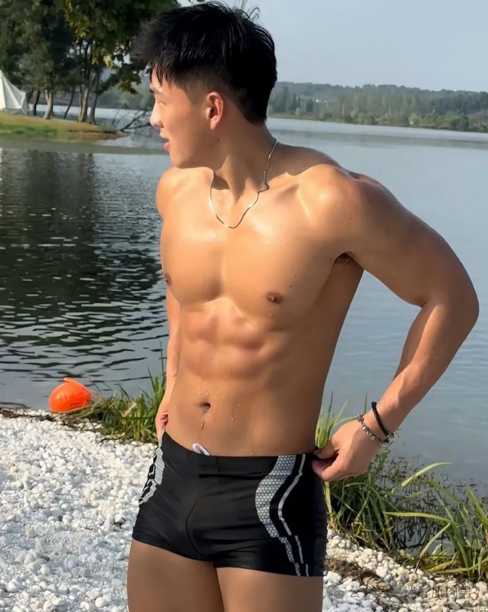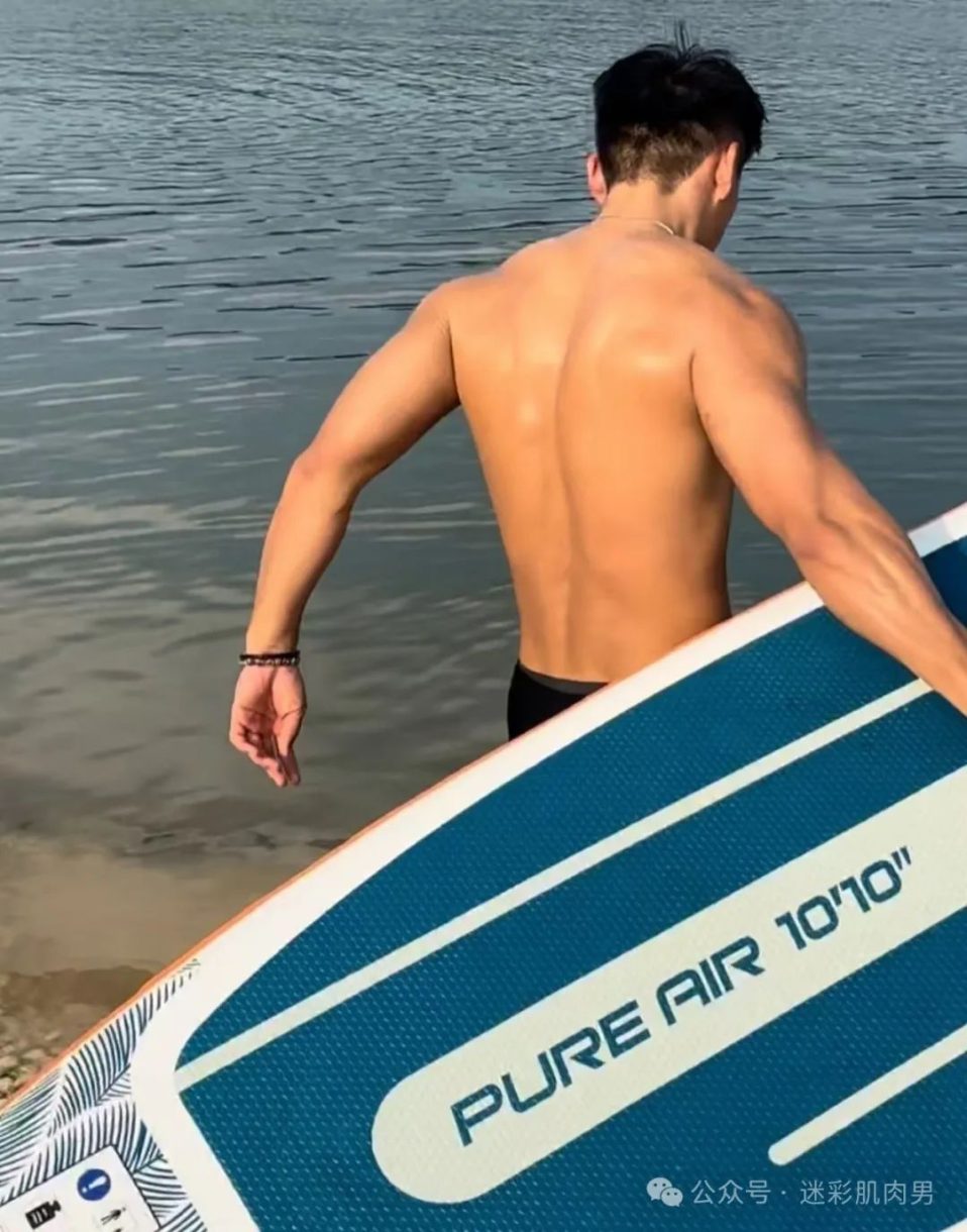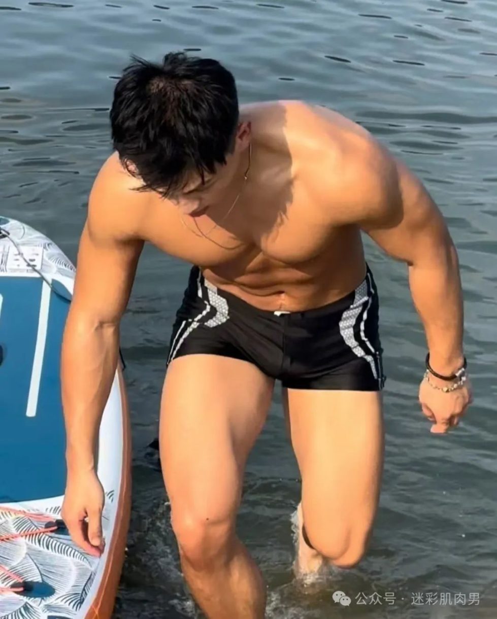 而那身泳裤,更是恰到好处地勾勒出他那令人惊叹的身材。胸肌如同两块坚实的盾牌,彰显着男性的阳刚之气。每一块腹肌都像是经过精心雕琢的艺术品,线条分明,充满了雕塑般的美感。那肌肉的纹理,似乎在诉说着他平日里对自己身体的严格管理和刻苦锻炼。“穿衣显瘦,脱衣有肉”这一形容在他身上得到了最完美的诠释。当他穿上日常的衣服时,或许会给人一种清瘦而优雅的感觉,但一旦换上泳裤,展现在众人眼前的便是那充满力量和性感的身材。