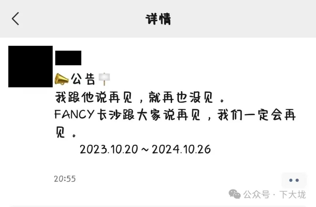2024年10月26日,在最后一晚的营业结束后,长沙gay吧——Fancy Club低调关店,结束其在星城刚满一年的运营。据下大垅了解到,长沙Fancy Club的一位员工在朋友圈发文表达不舍,他写道:“我跟他说再见,就再也没见,Fancy长沙跟大家说再见,我们一定会再见。”此外,他还注明了长沙Fancy Club的运营时间,2023年10月20日开业,2024年10月26日关店。