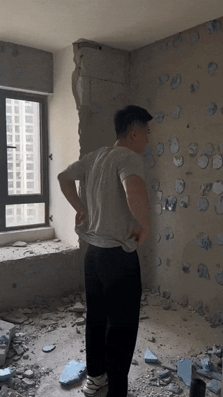 说到他工作的时候,还有一个特别有趣的习惯。每次砸墙前,他都会习惯性地脱掉自己的上衣。他觉得这样可以没有任何束缚,能更好地发挥力量。