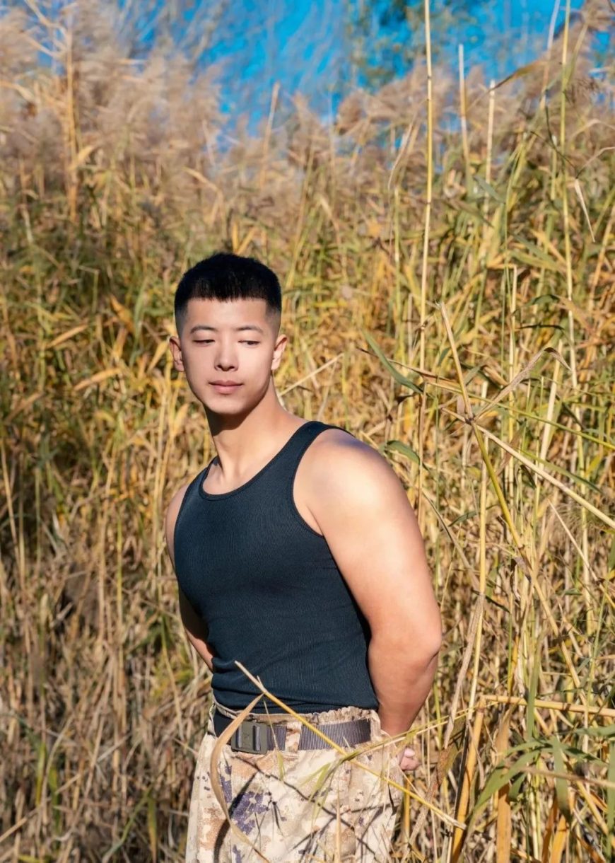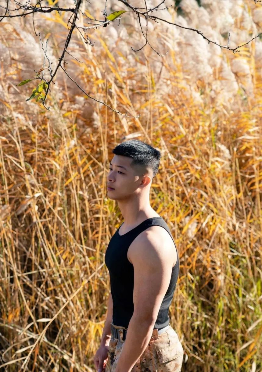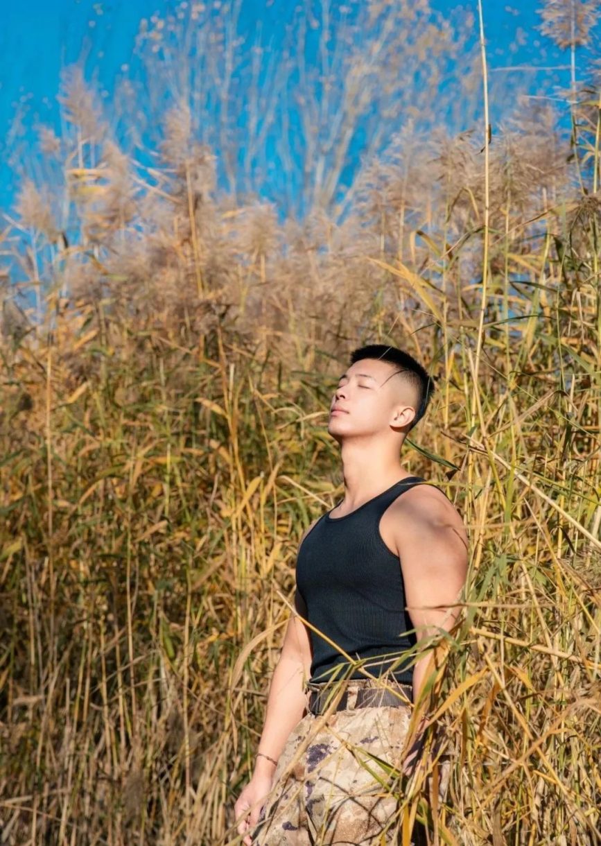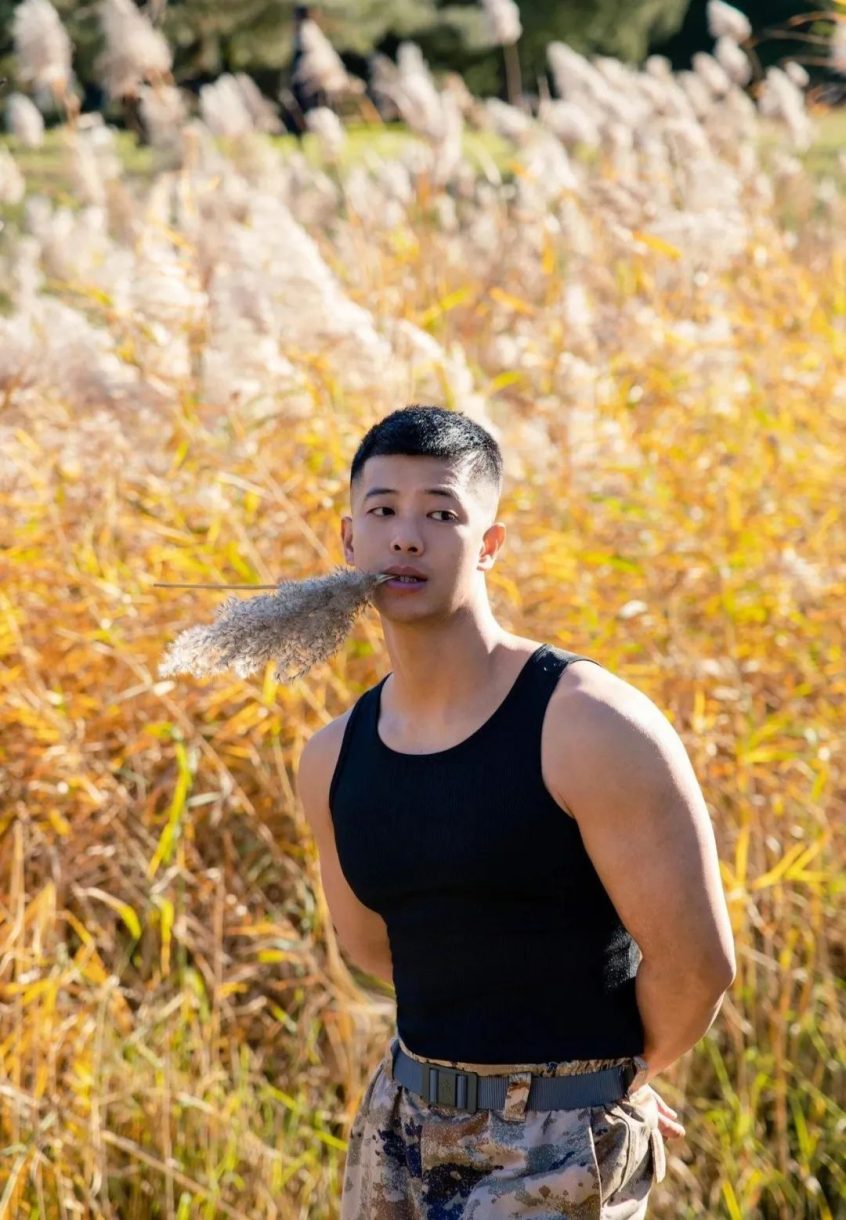 当秋风吹拂,芦苇荡泛起层层波浪,在这一片金黄与洁白交织的世界里,出现了一抹令人热血沸腾的身影。那是一位寸头迷彩肌肉健身帅哥,宛如从秋日画卷中走出的勇士,将炽热又勇敢的青春诠释得淋漓尽致。