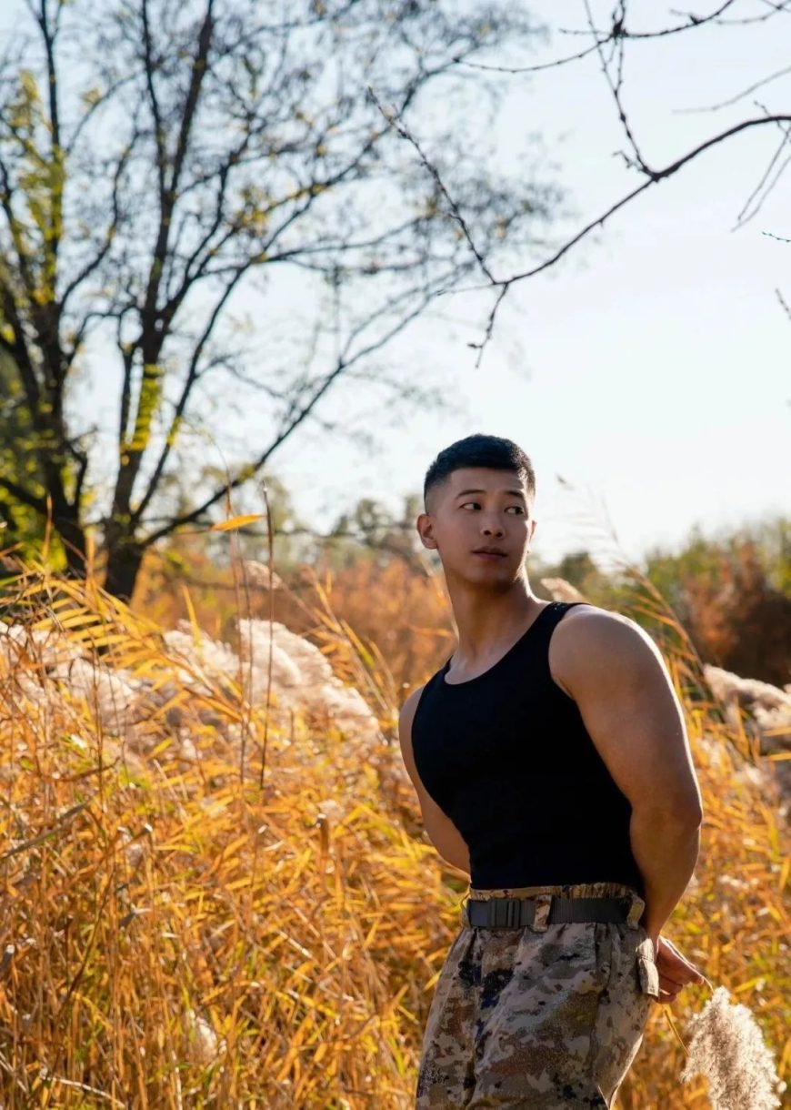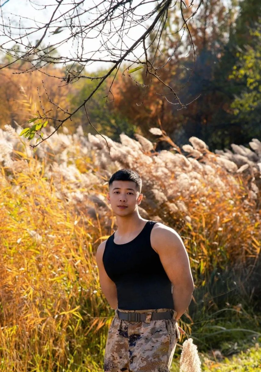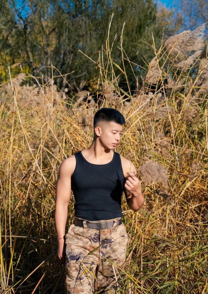 当秋风吹拂,芦苇荡泛起层层波浪,在这一片金黄与洁白交织的世界里,出现了一抹令人热血沸腾的身影。那是一位寸头迷彩肌肉健身帅哥,宛如从秋日画卷中走出的勇士,将炽热又勇敢的青春诠释得淋漓尽致。