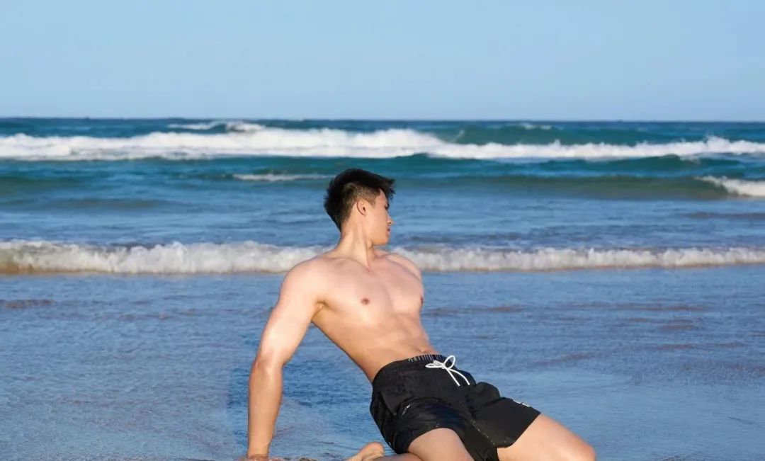 海边煜煜发光薄肌男,拍照姿势绝不是直男!