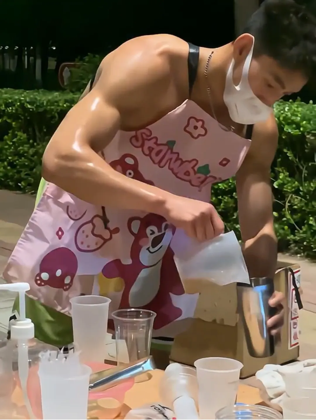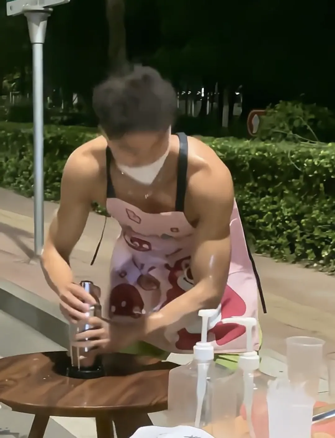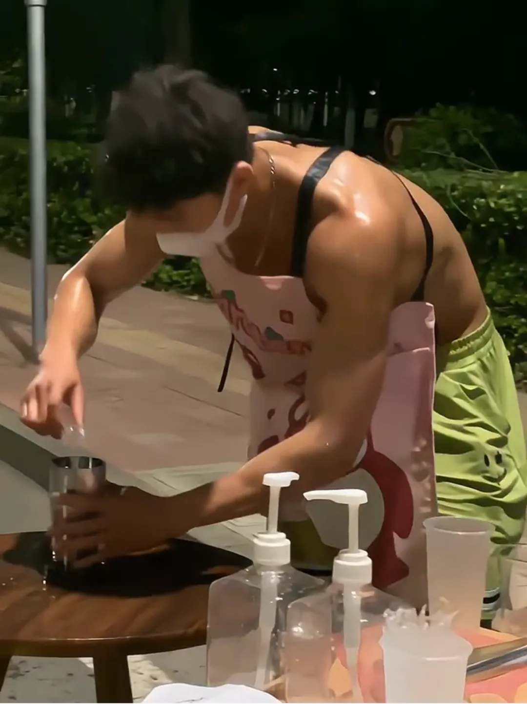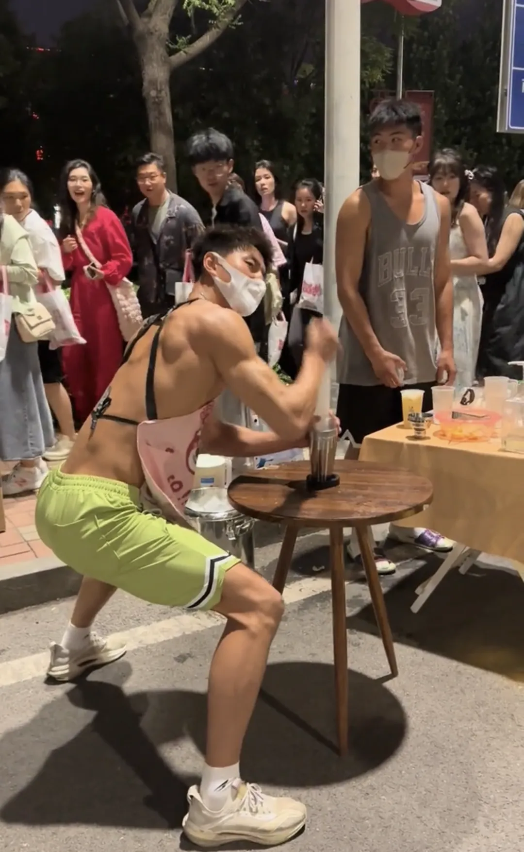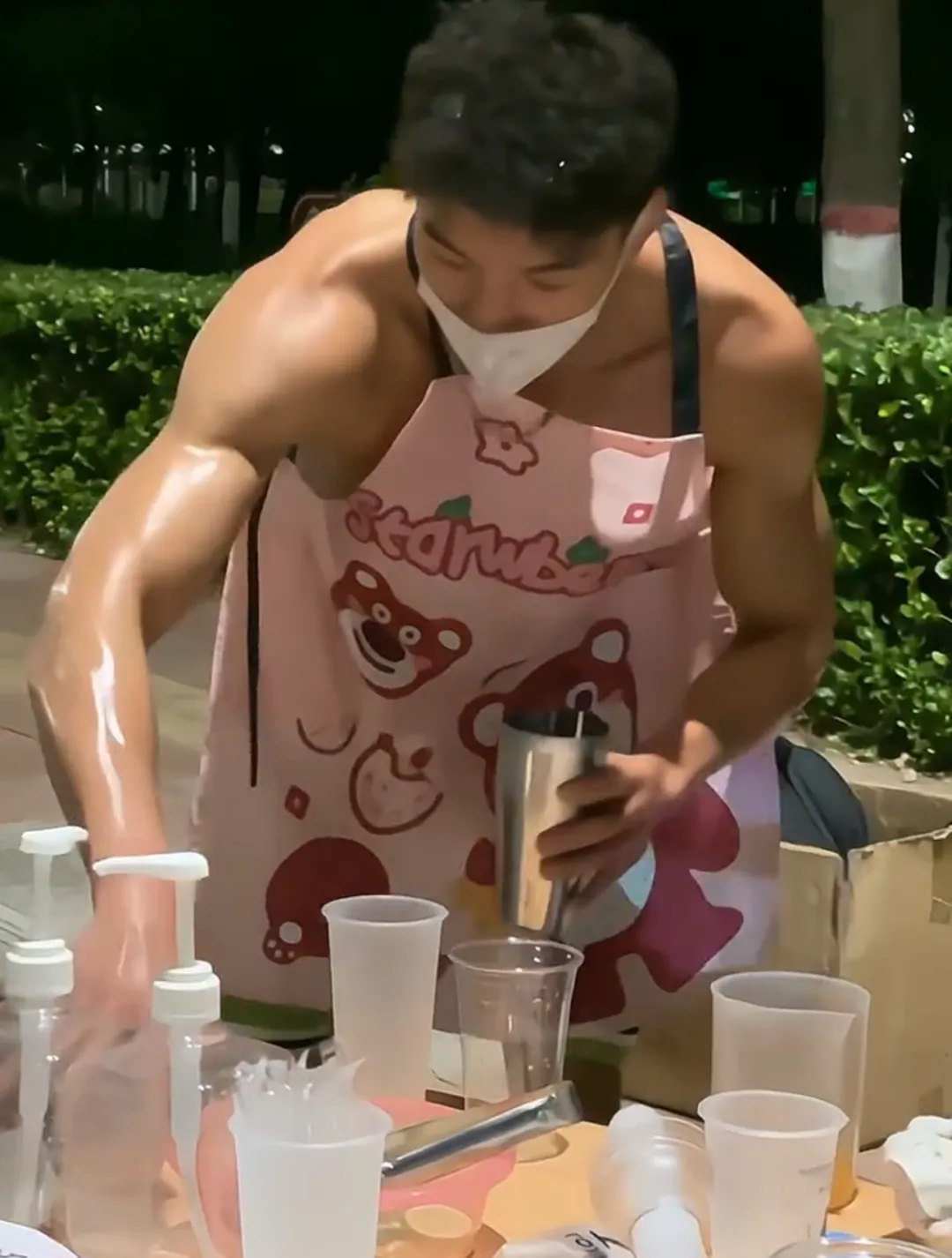 肌肉小哥哥是完全懂得生意怎么招揽的,直接没穿衣服上阵来手打柠檬茶。
