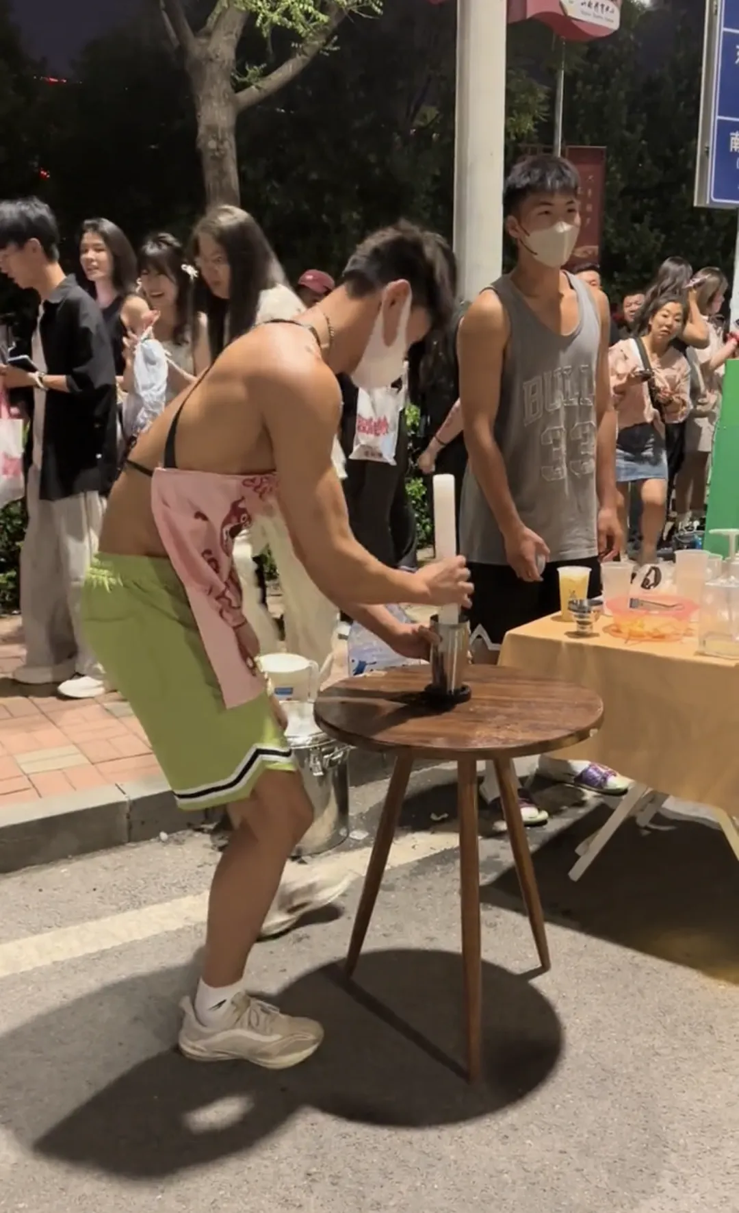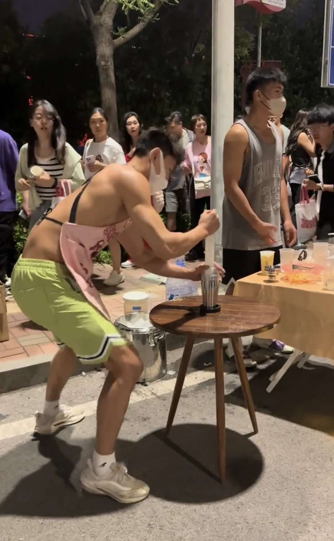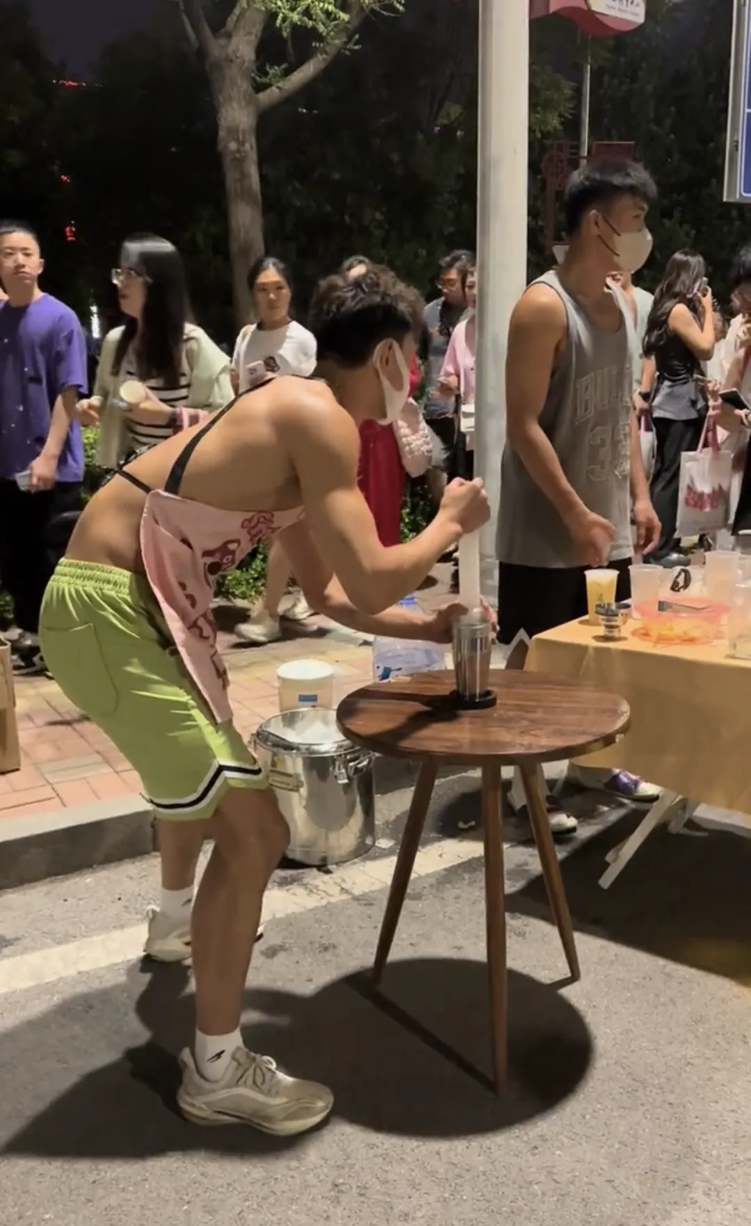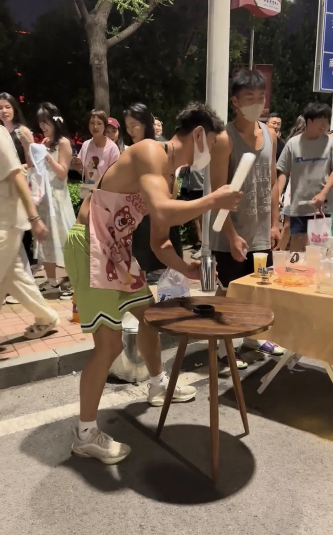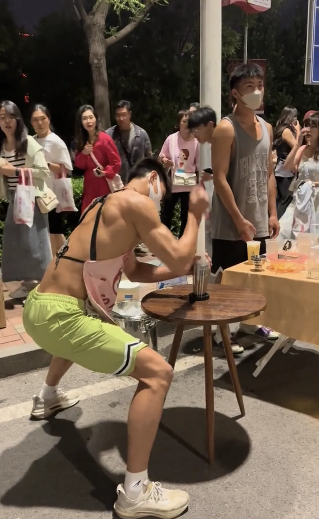 肌肉小哥哥是完全懂得生意怎么招揽的,直接没穿衣服上阵来手打柠檬茶。