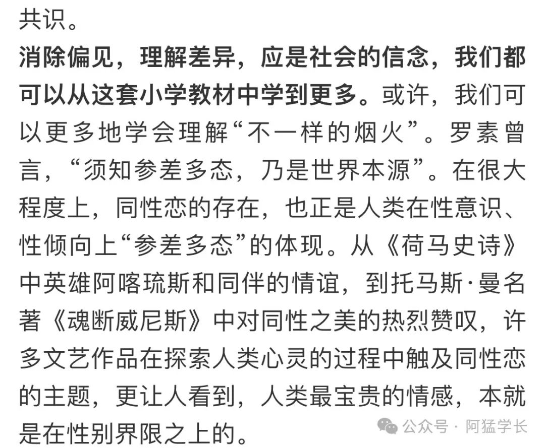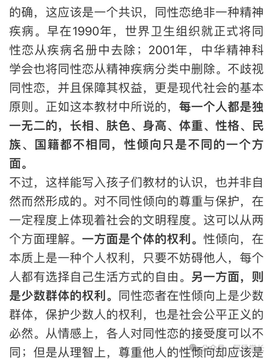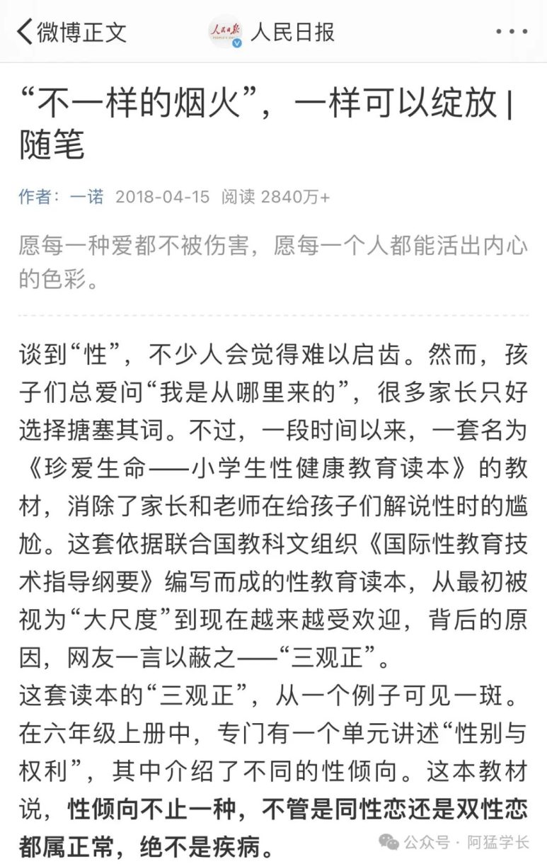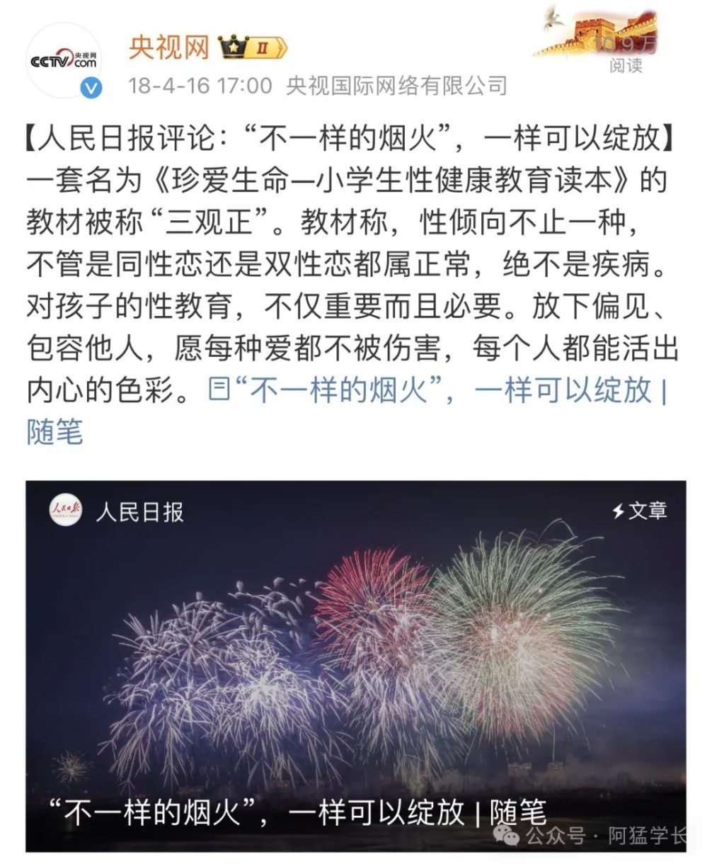 文章以一本小学生的性教育读本为引子,阐述了央妈视角下的4个观点:1、性少数不是精神疾病。2、性少数不应该遭受歧视。3、对于性少数的保护和尊重,体现着社会文明发展的程度。4、性少数也是正常公民,在主张权利的同时,也应该承担起部分社会责任。