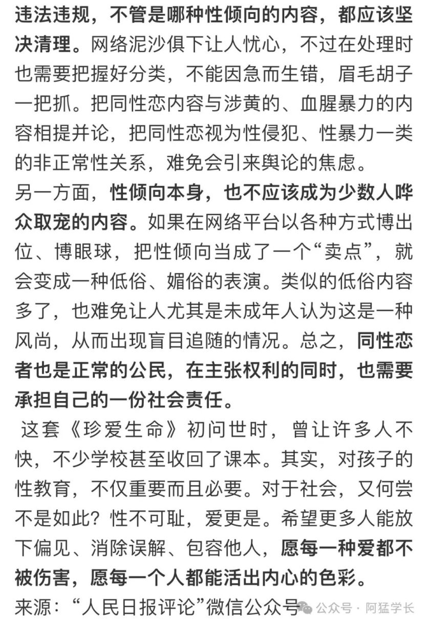 所以不要一直以为央妈很传统保守,它在某些情况下也真的是希望:“每一种爱都不被伤害,每一个人都活出内心的色彩。”如果以后有人问你自己的性取向,你自己又自卑胆怯支支吾吾解释不清楚的话,其实完全可以把这篇央妈的文章转发给他们,让他们心服口服。