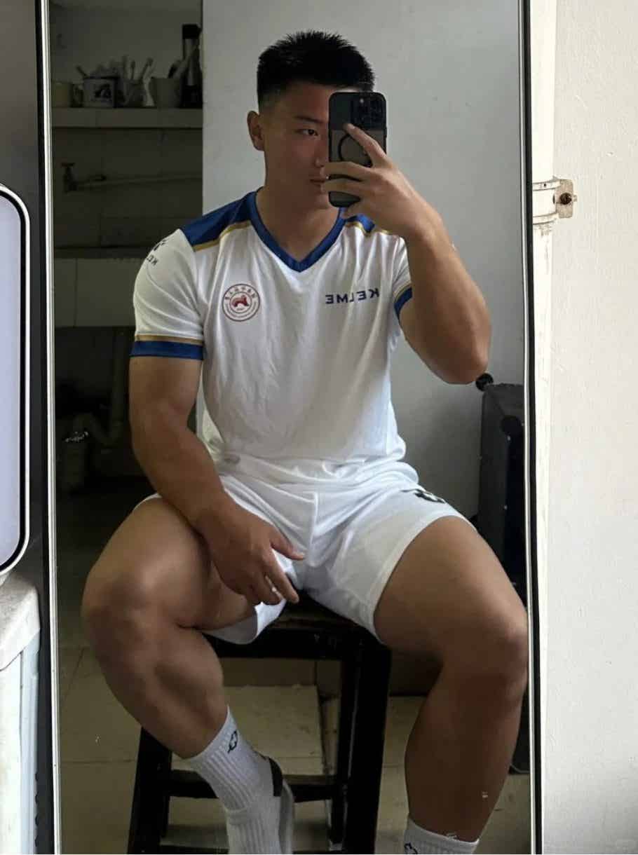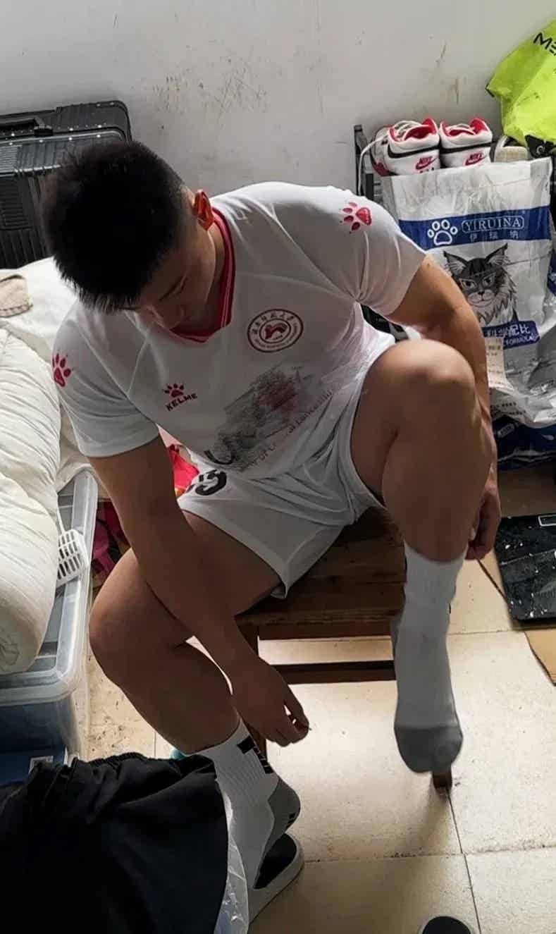 足球运动对下肢力量要求极高,小哥每日进行大量腿部训练,传球、过人、高抬腿、深蹲等练习从不间断,这使他的大腿愈发粗壮有力,比常人粗出许多。在更衣室换衣时,队友常被他的黑皮粗腿吸引,忍不住抓拍。