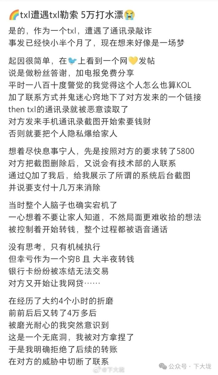 基友的爆料帖子/截图骗子以曝光他的同性恋性取向隐私为由,对他开始了敲诈勒索。没有相关经验的他按照对方的要求转了5800元,之后骗子更是让他网贷转钱,他又转给了骗子4万多,合计损失了5万块。5万块——这是许多年轻人一年的收入。被骗走5万元,意味着一年白干。他因为贪图网黄博主的免费资源,一步步掉入骗子精心设计的圈套中,接下来的时间里,他需要努力打工赚钱来偿还债务。而他喜欢的那位网黄博主,则完全置身事外,将粉丝当做韭菜收割,和诈骗集团站在一起。实际上,下大垅在公众号多次写过这类的电诈骗局。Gay圈网黄、知名男体摄影师都有涉案,他们接下诈骗集团的推广链接,专门坑害粉丝,让他们损失惨重。结果粉丝投诉无门,只能默默承担一切。