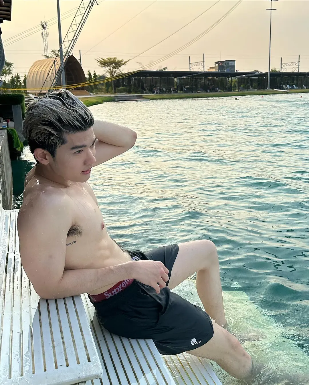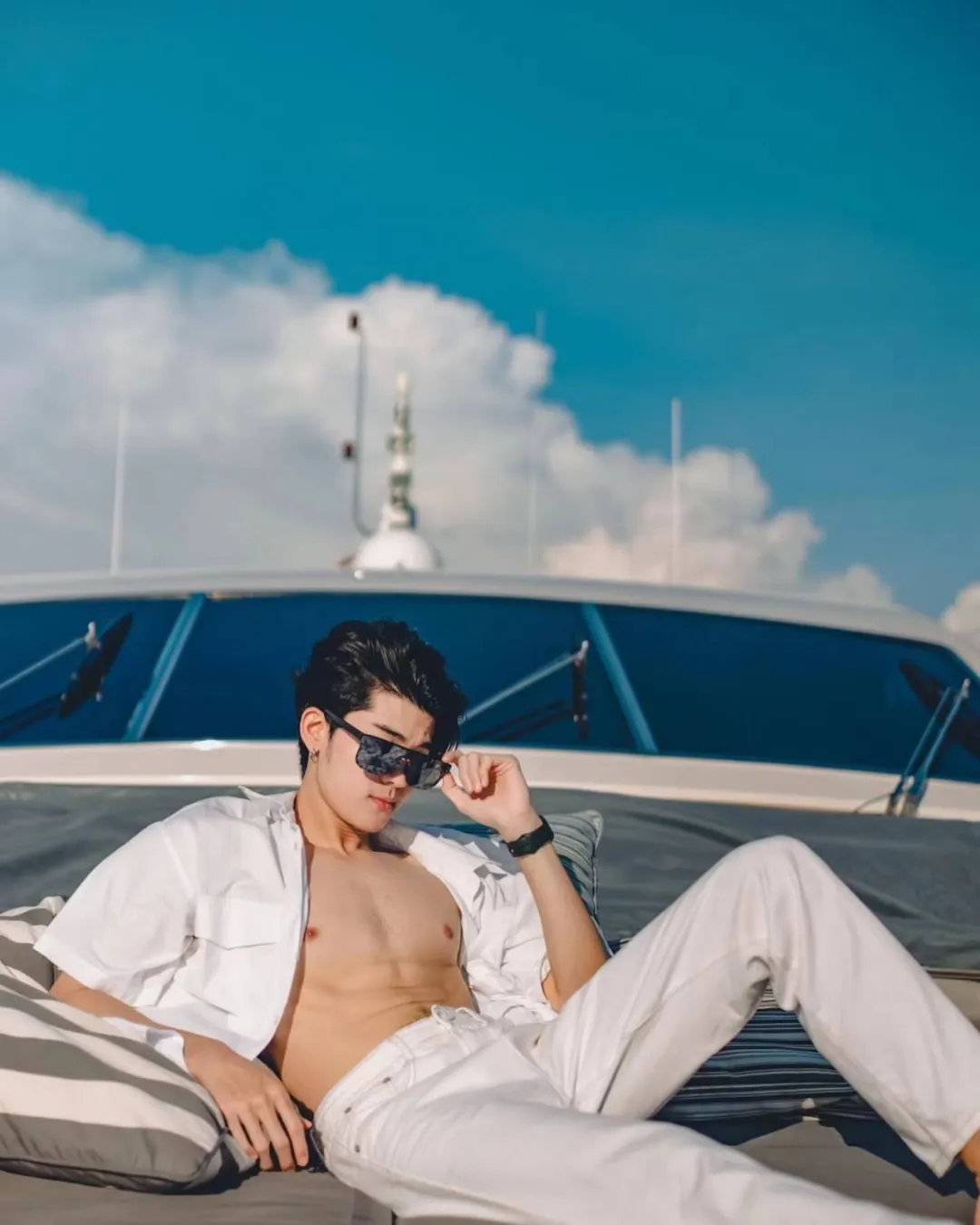 Boom五官立体且协调,眼睛深邃明亮,鼻梁高挺;嘴唇则恰到好处地展现了男性的性感与温柔。他的脸型轮廓分明,既符合现代审美中的帅气标准,又保留了一份独特的泰国风情。