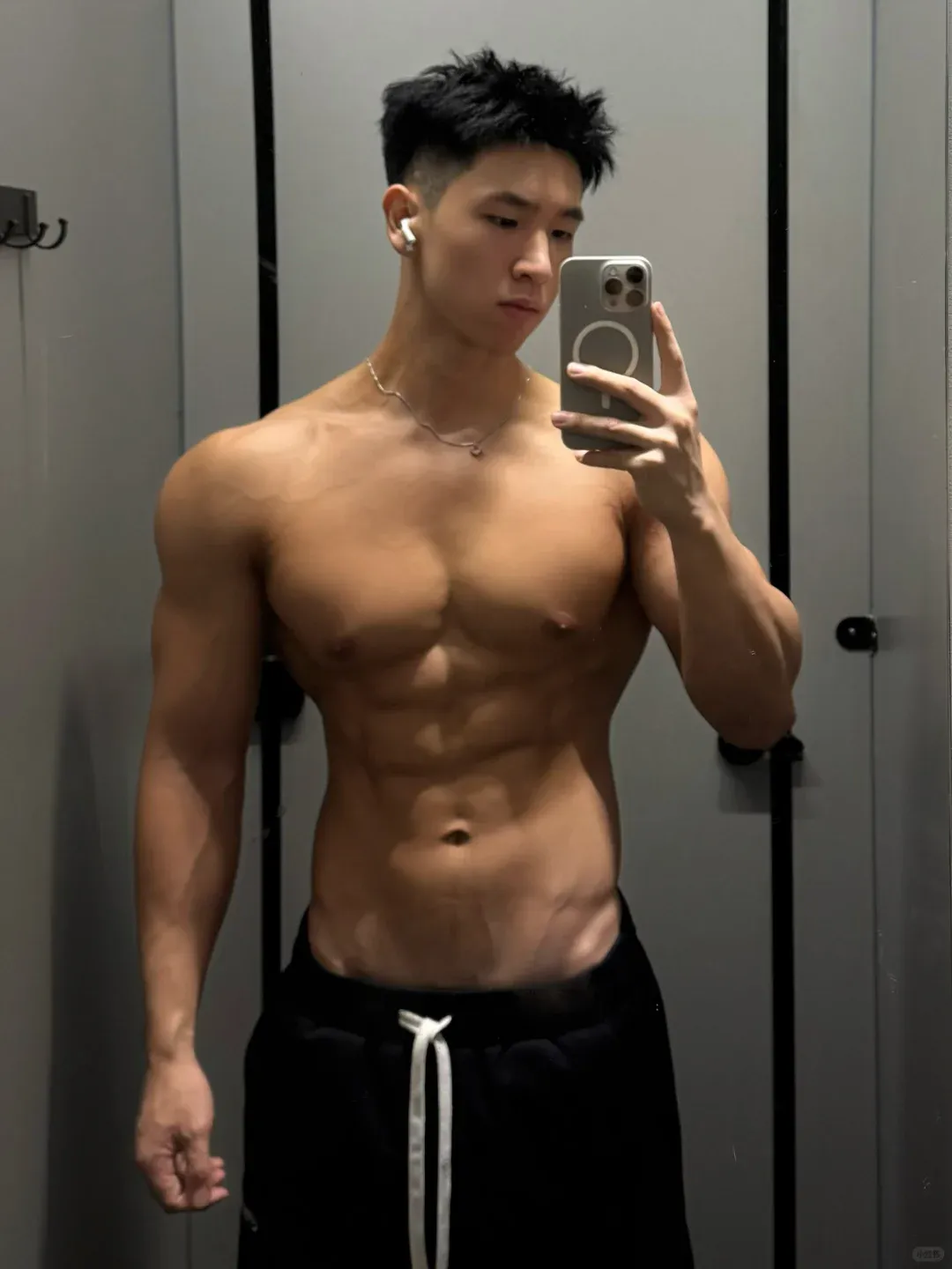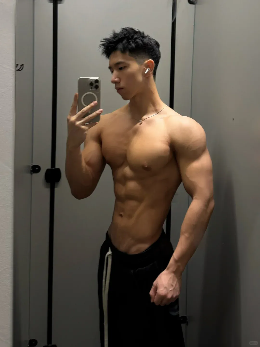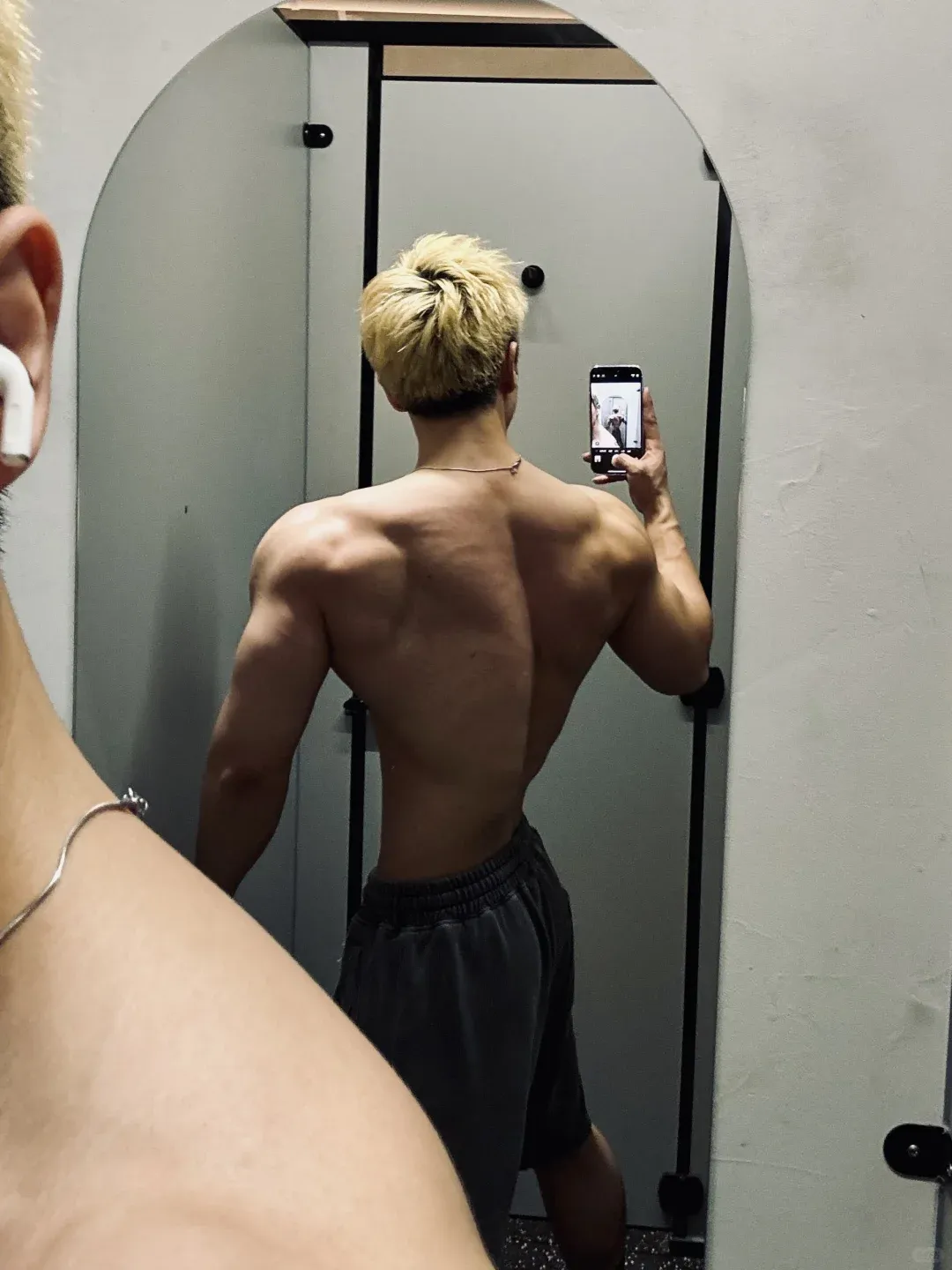 除了手臂外,小哥哥其他部位的肌肉练得也是相当不错的。他胸部厚实、肩部外翻、背部的肌肉维度、分离度都相当不错。还有不少地方能看到明显的拉丝。