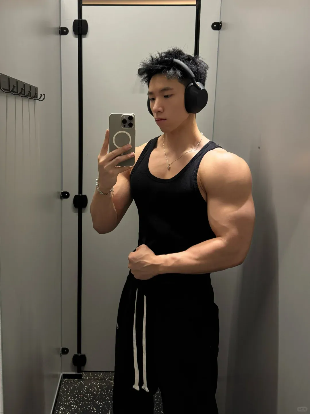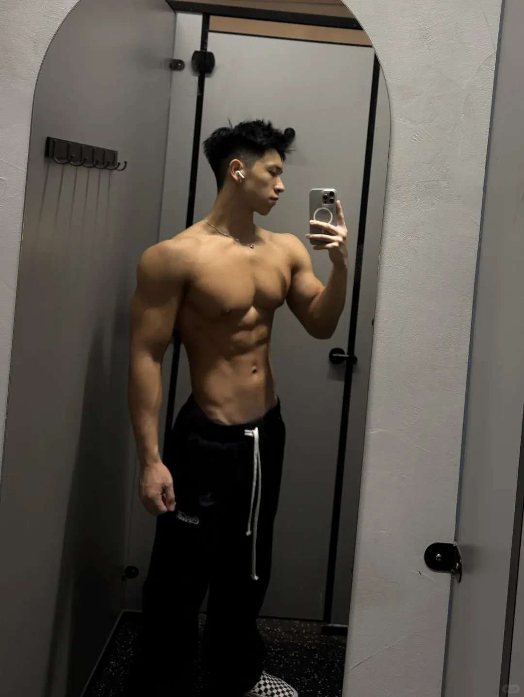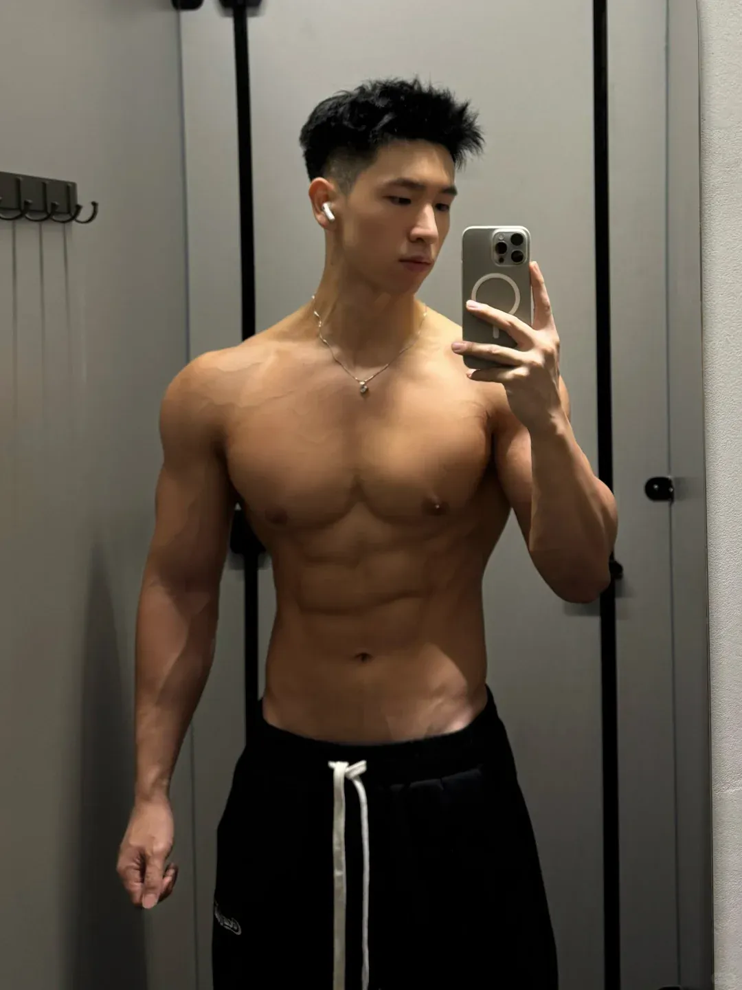 除了手臂外,小哥哥其他部位的肌肉练得也是相当不错的。他胸部厚实、肩部外翻、背部的肌肉维度、分离度都相当不错。还有不少地方能看到明显的拉丝。
