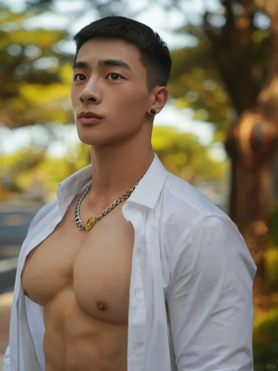 乍一看去,小哥儿穿着那件白衫立领外袍,分外端庄贵气,却又透着一股锐气逼人的侠客魅力,让人忍不住要倾倒在此。而当你再把目光落下时,恍然发现原来外表并非云淡风轻,下面竟蓄势待发着一副魁梧雄伟的好身材!