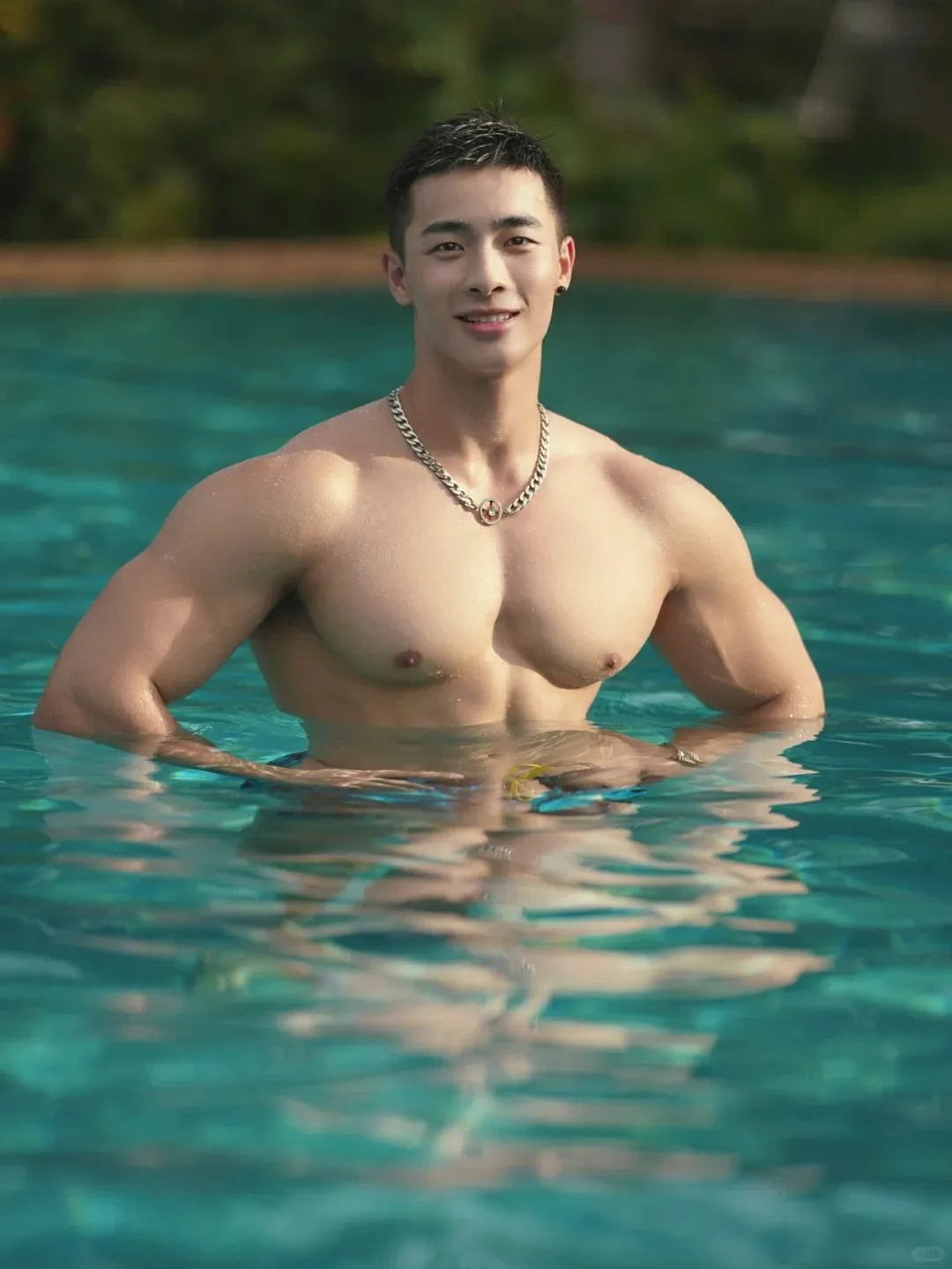 转过身去,你就能更清晰地看见小哥儿的后腰窝和撩人的腰线了。腰间赘肉全无,腰身纤细有致,却又饱满结实而毫不单薄。上下左右地望去,无论哪个角度看去,小哥那精壮有型的半裸出水身材都同样让人心动不已,在视线的注目下仿佛要奋力绽放生机勃勃的活力了!