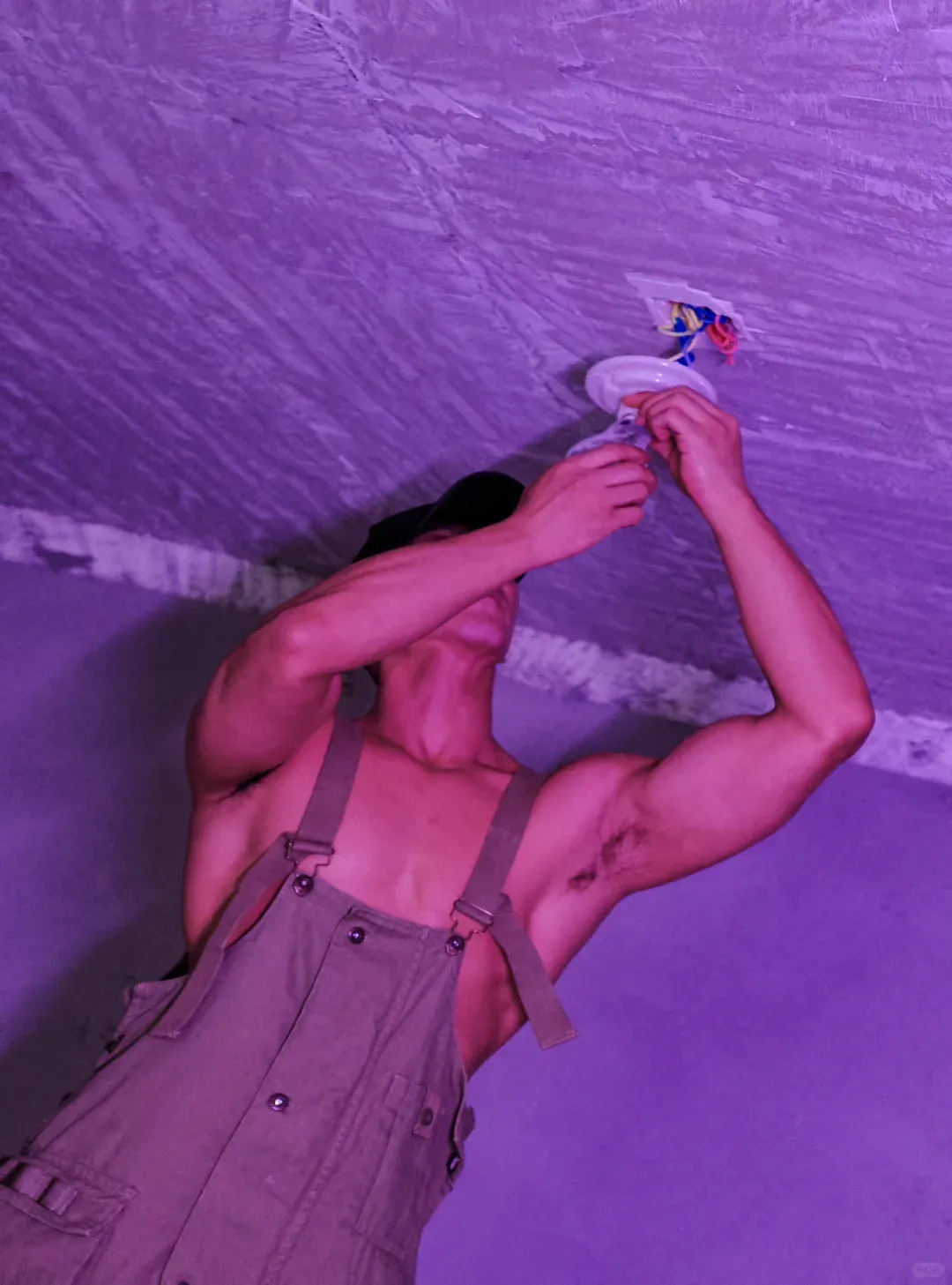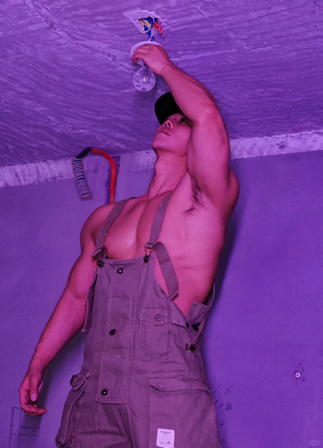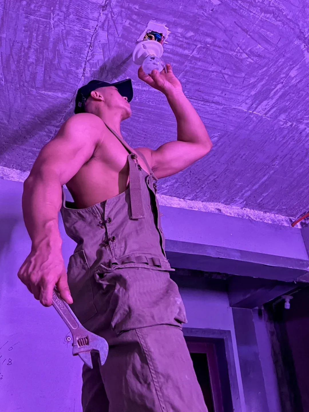 想象一下,如果家里装修能请到这样的工人,估计眼睛都得看直了吧,还谈什么工资啊,倒贴都愿意!尤其是他安装电灯泡时的那个仰拍角度,巧妙地将他那壮硕的肌肉线条勾勒得更加明显,这谁顶得住啊?要是他来我家干活,我肯定得亲自下厨,把他留下来好好款待。