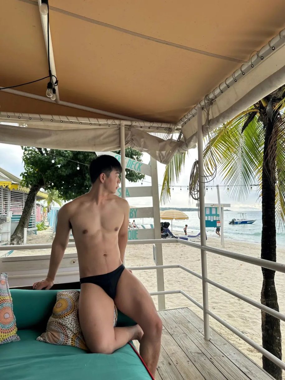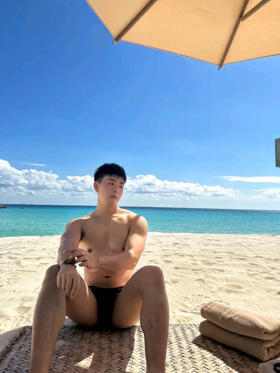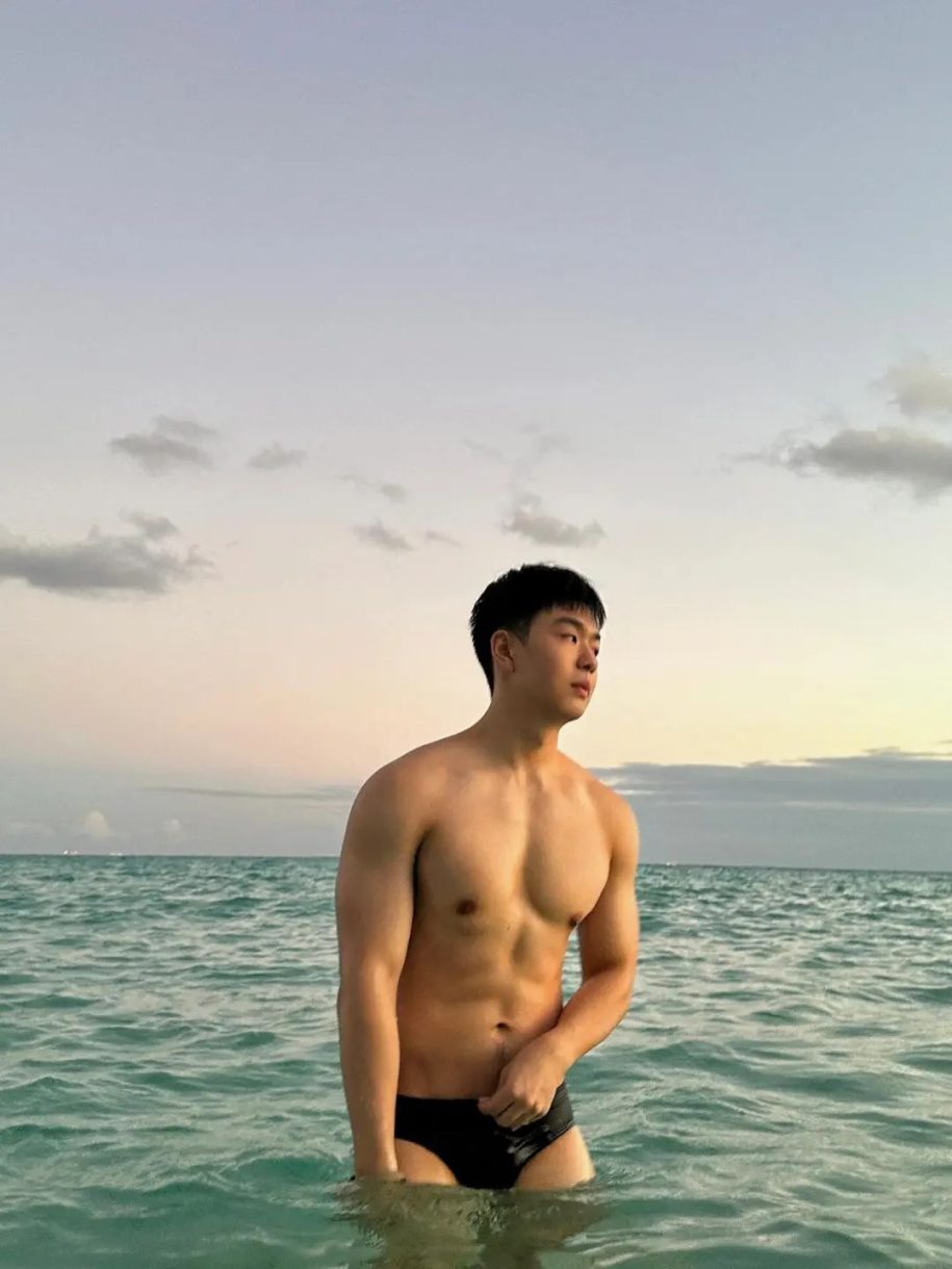 这位小哥最引人注目的,当属他那迷人的身材。他身着黑三角内裤在海边的照片,简直是荷尔蒙爆棚。那薄肌身材,恰到好处的肌肉线条,光滑的皮肤在阳光的照耀下散发着健康的光泽,宛如古希腊神话中的少年。