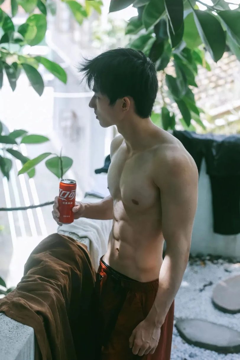 出镜的小哥哥来自湖南,23岁,完美的小肌肉身材,让他可以演绎出青春少年在夏日的热烈和性感。 在枝叶间洒下的阳光中,一个少年如同夏日的精灵,倚靠在白墙旁,散发着青春的光辉。他手持一罐冰凉的饮料,线条分明的腹肌在斑驳的阳光下显得格外引人注目,肌肉轮廓随着呼吸的起伏,如雕刻般完美。
