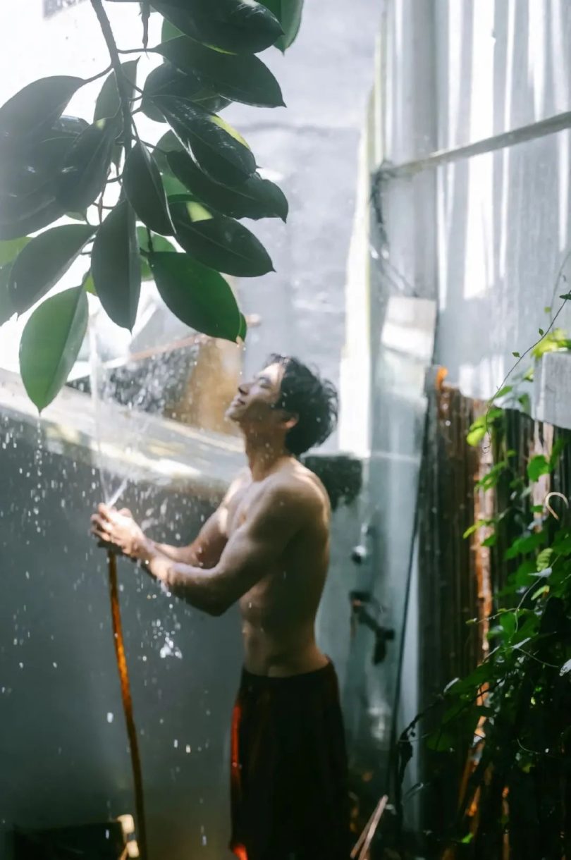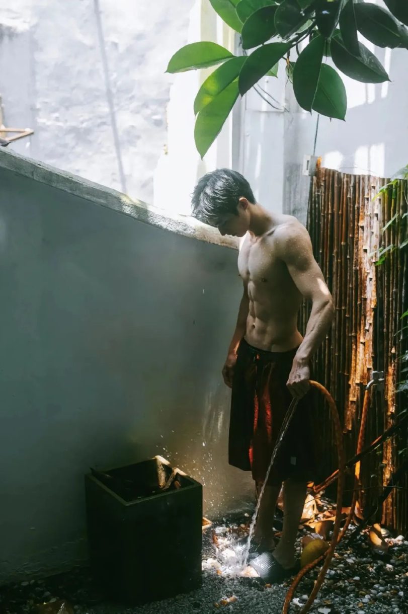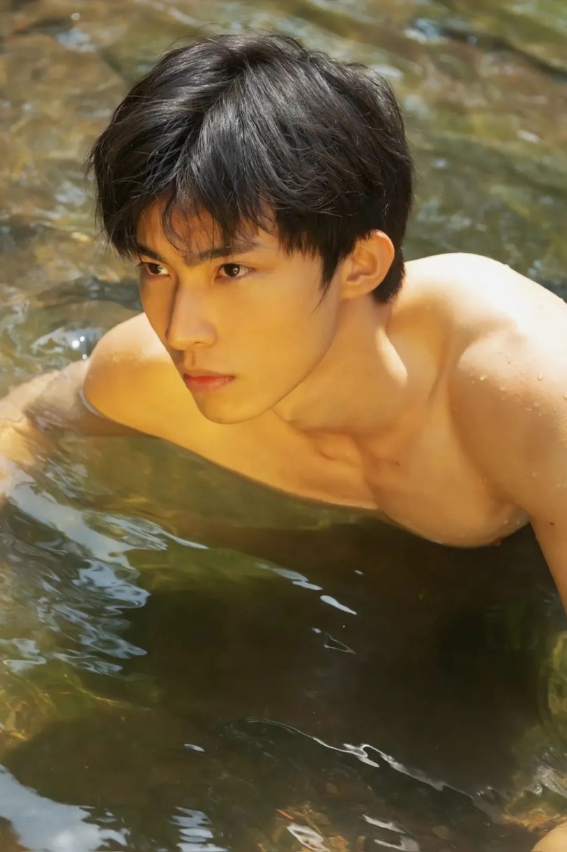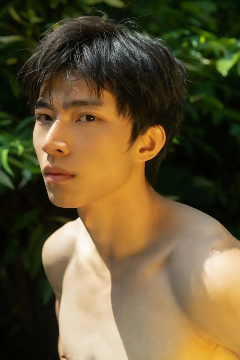 少年站在淋浴喷洒的水柱下,闭上双眼,仰头感受这片刻的清凉。他的微笑宛如阳光刺破云层,纯粹而温暖,令人不禁为这短暂而恒久的夏日瞬间感到怦然心动。 夏日的气息在这里定格,伴随着少年的自由与无拘。他的一举一动,流露出青春的无畏与自信,而那匀称结实的腹肌,则是他挥洒汗水后的骄傲勋章。在这片片绿叶和阳光的见证下,他成为夏日的化身,既是蓬勃生命的象征,也是无尽美好的代名词。
