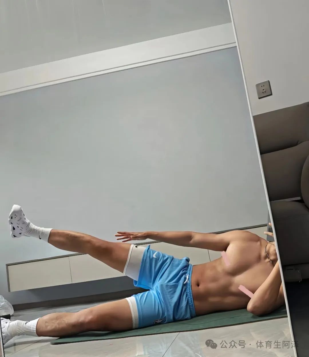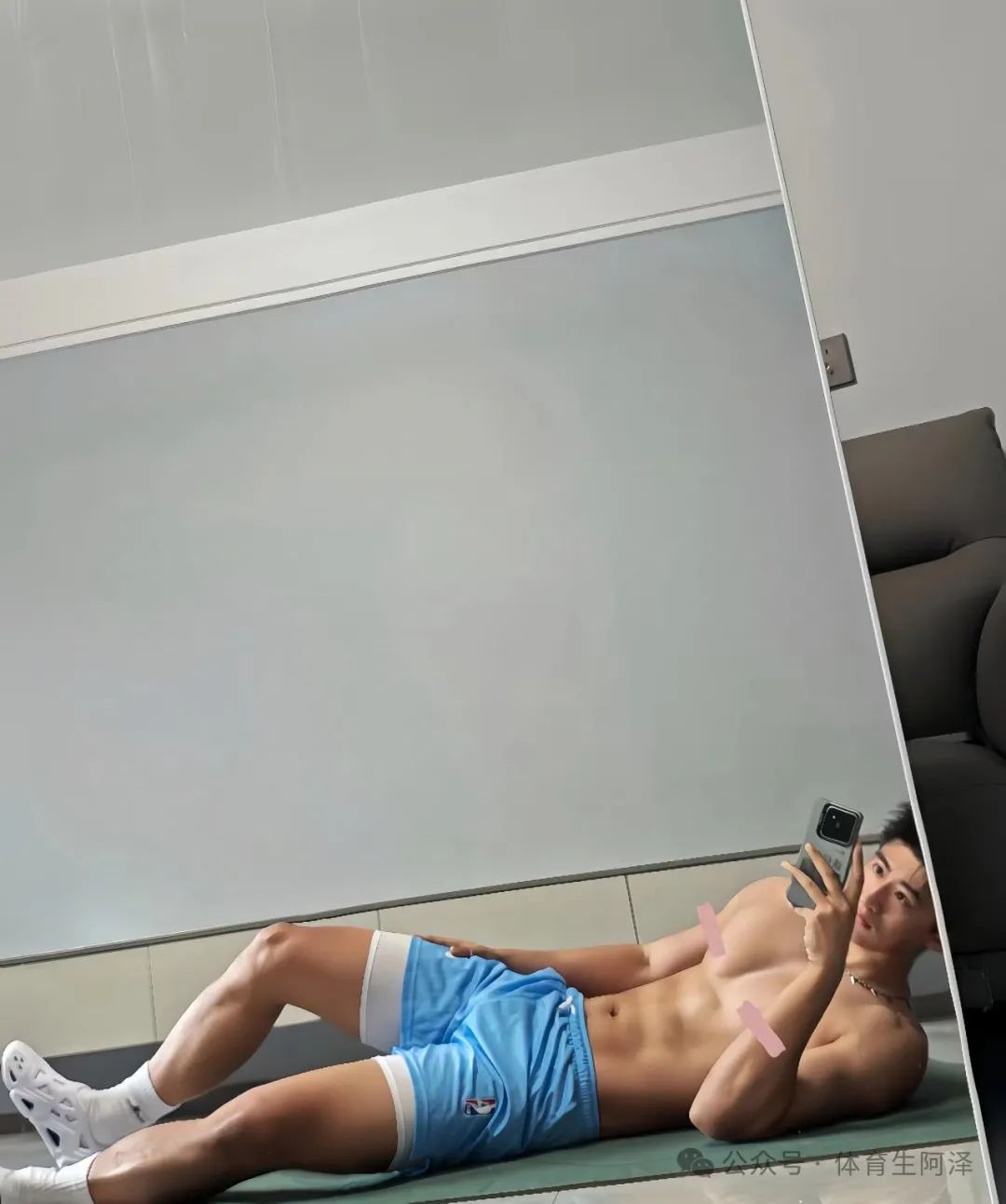 就光这个拍照自己阿泽感觉是个直男都想不到啊哈哈哈哈。穿着高弹和白袜然后躺在地上一个手臂支撑四肢,然后两个健壮的长腿摆出这个诱惑的姿势。真的是帅到阿泽了,尤其是上半身的肌肉。光是躺着都能看到这个身材很健壮啊!要是阿泽在现场,那绝对是要坐上去的节奏啊哈哈哈哈哈。尤其这个是胸肌,看上去非常的美味,阿泽要好好的品尝一下,腹肌也是yyds这么极品的S阿泽好久没遇到了。