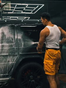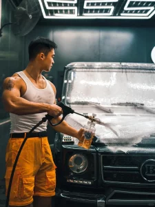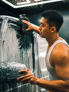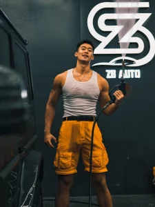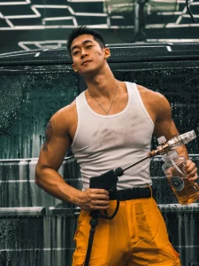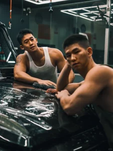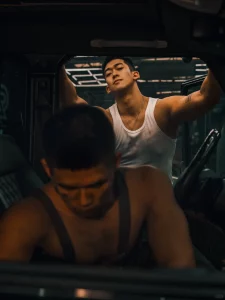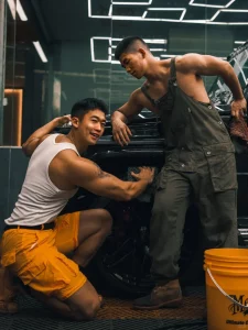 Allen穿着简约的白色背心和牛仔裤,搭配略显随意的工装手套,整个造型给人一种自然又不失力量感的感觉。他半蹲在车旁,一边检查轮胎一边用扳手调整螺丝,手臂上紧绷的肌肉线条清晰可见,似乎每一块肌肉都在为修车服务。