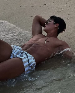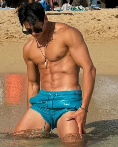 他还常常会在沙滩上搭配一些小配饰,比如墨镜、手链或者运动帽。这些配饰并不繁琐,却能恰到好处地增强他的整体气质。简洁而不简单,这就是小哥的风格。
