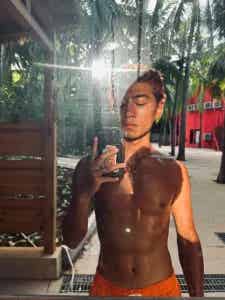 咱们就是男模特的身材比例就是好,健身成果恰到好处,一身腱子肉看上去很精干紧实,有力又不失美感,胸肌、腹肌的轮廓清晰可见,又没有那么夸张,妥妥的薄肌男孩了。