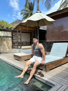 小哥哥的肩膀练得挺宽的、腰也挺细,他的手臂肌肉维度练得也是相当不错的。可惜的是小编在小哥哥的小红书里找了找,只找到下面这一张小哥哥展示自己身材的照片。而且还是一张在海边晒伤之后的照片。我们也只能从小哥哥的一些背心、紧身衣的照片中来 YY 一下他的身材了。