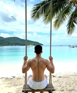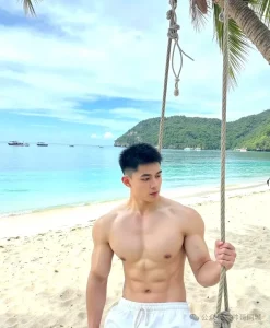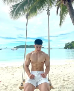 在那片洁白无瑕的沙滩上,帅气阳光的肌肉男正悠悠地荡着秋千。