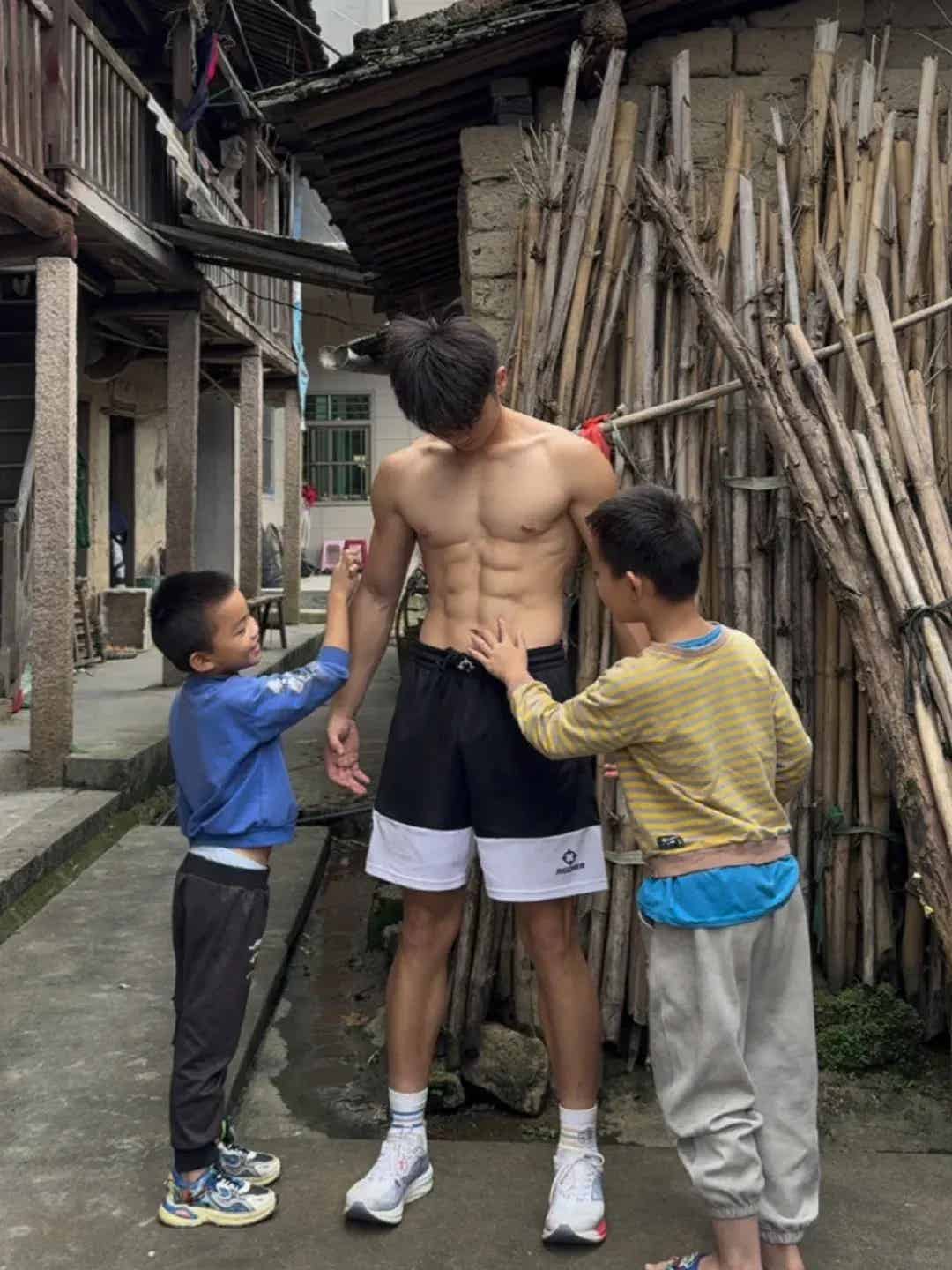 有人看他的篮球动作,还有人盯着他的腹肌拍视频。小肖的身材属于那种不夸张但很精致的类型,腹肌线条清晰,肩膀也很宽,这种少年感的身材让他成为了村里的焦点。几张被路人拍下来的照片还意外地火了一把。